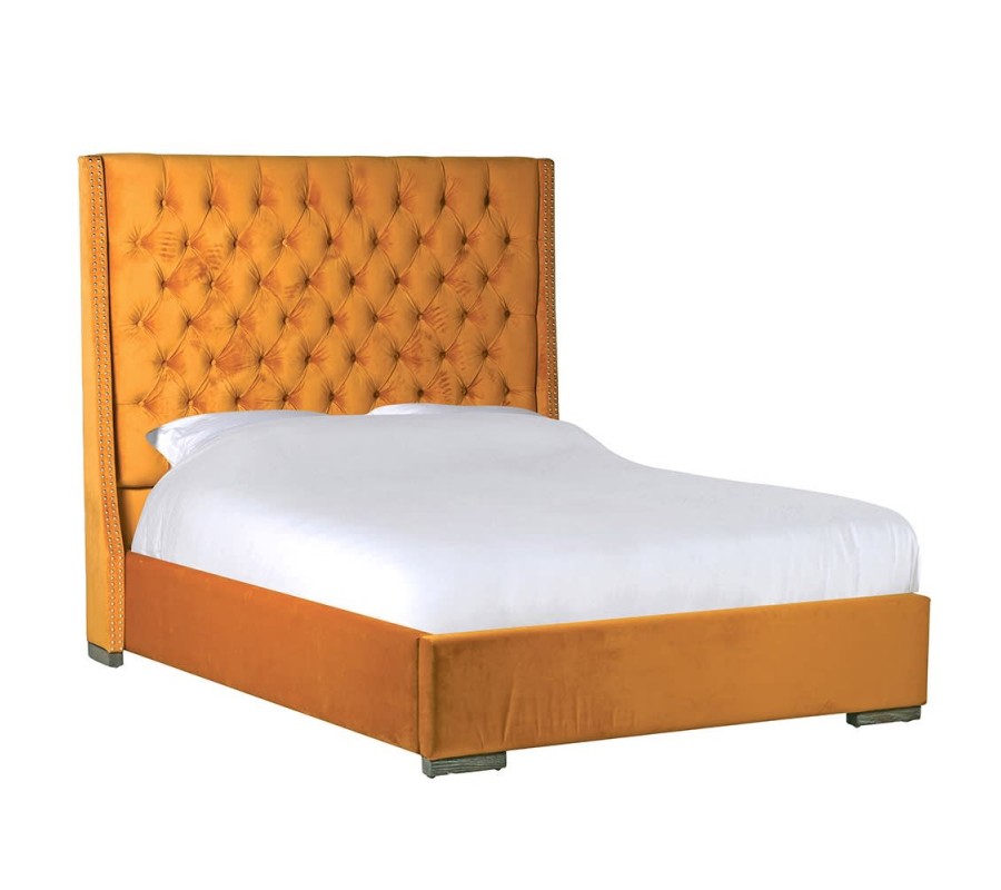 Luxusná manželská posteľ Senapa sa stane veľmi výrazným a obľúbeným kusom nábytku vo vašej art-deco štýlovej spálni. Pohodlnosť a luxus sú prvé slová ktoré sa spájajú s touto posteľou. Luxusné prevedenie v podobe výrazného zamatového čalúnenia horčicovo žltej farby vás určite zaujme aj vďaka svojim zaujímavým dizajnovým prvkom v podobe Chesterfield prešívania na čele postele, ktoré je typickým prvkom v art-deco nábytku. Vysoké čelo je taktiež aj obohatené o dizajnové cvoky v striebornej farbe, ktoré sa nachádzajú po bokoch čela od vrchu až po samotný spodok k nožičkám. Spomínané nožičky sú z dreveného masívu v hnedej farbe so sivým odtieňom, čo dodá zaujímavý farebný kontrast. Vďaka svojím bohatým rozmerom 160x210 cm si na manželskej posteli nájdete dosť miesta aj vy aj vaša polovička. Kvôli svojmu farebnému prevedeniu odporúčame kombinovať manželskú posteľ s výrazným a farebným nábytkom v art-deco štýle s kovovými alebo zrkadlovými doplnkami alebo nočnými stolíkmi.
