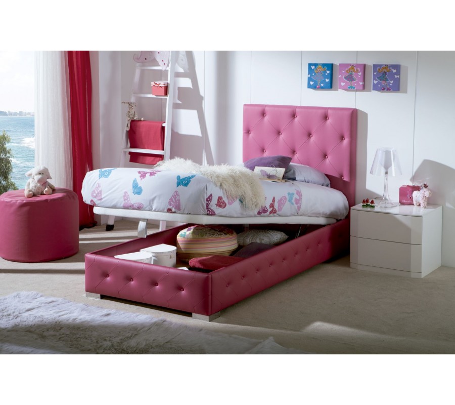 Moderná štýlová posteľ Raquel s ružovým koženým poťahom s chesterfield prešívaním a s úložným priestorom 90-105cm