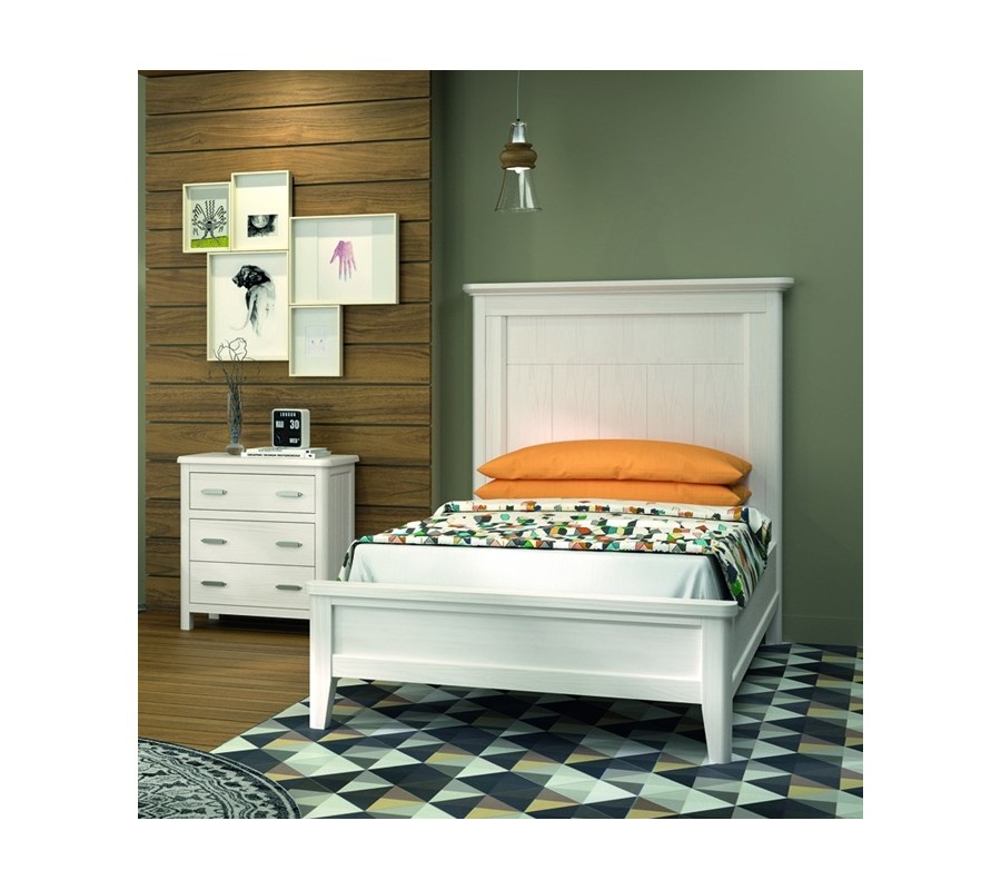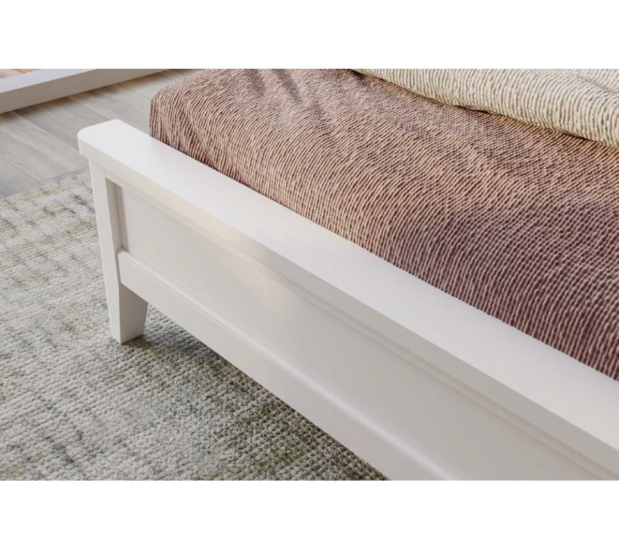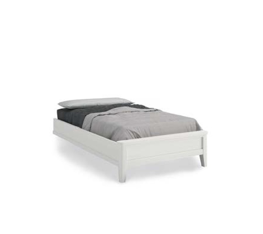 Základňa postele je tiež vyhotovená z masívneho dreva. Štyri nožičky sú jemne prehnuté a vytvárajú elegantnú siluetu. Kazetový dizajn päty zasa nadväzuje na vizuál čela. Posteľ je k dispozícii v dvoch veľkostných prevedeniach - s čelom so šírkou 109 cm pre 90 cm matrac a s čelom so šírkou 124 cm pre 105 cm matrac.