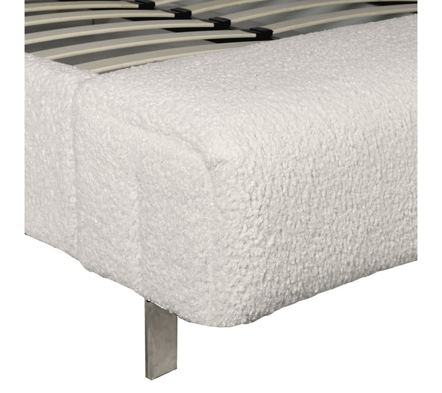 Pohodlie v posteli Dolly II kráľovských rozmerov navyšuje unikátne čalúnené prevedenie z mäkkého poťahového buklé v jemnej krémovej bielej farbe. Drevená konštrukcia postavená na štyroch kovových nožičkách v striebornom prevedení vyniká robustným predným čelom oblého tvaru s jemne rozšíreným tvarom v hornej časti. Posteľ vás poteší kvalitou odpočinku, ktorú ponúka vďaka praktickému a zároveň štýlovému dizajnu nesúceho sa v jednoduchých nadčasových líniách moderného štýlu. Originálne hrejivé čalúnenie pripomímajúce príjemne mäkkú ovčiu vlnu vás nachne natoľko, že sa budete chcieť ihneď zamotať do perín a užívať si komfort postele. Obrovským pozitívom postele Dolly II je stupačka na nohy, ktorá posteľ zväčšuje a vám poskytuje priestor na vyloženie si nôh či ako lavica pri obliekaní sa. Svoje miesto si nájde v štýlových moderných či art deco ladených spálňach s koženými doplnkami v podobe kresla či tmavej hnedej masívnej komody.
