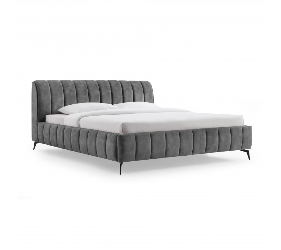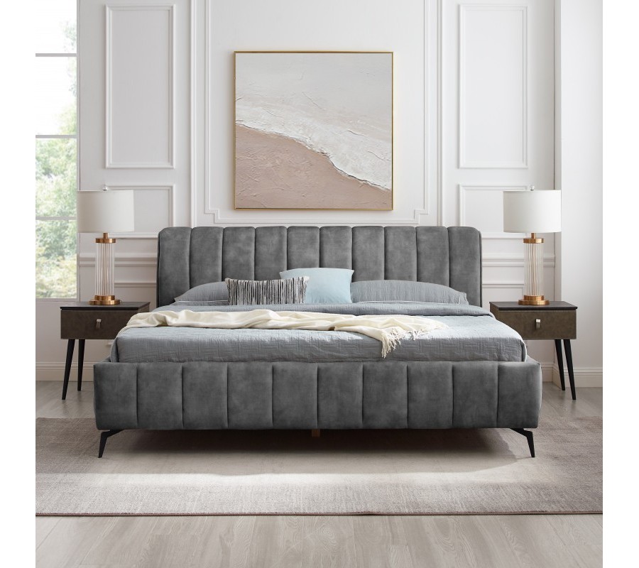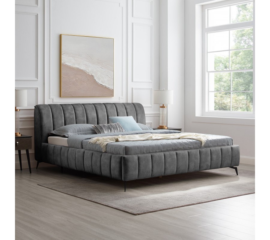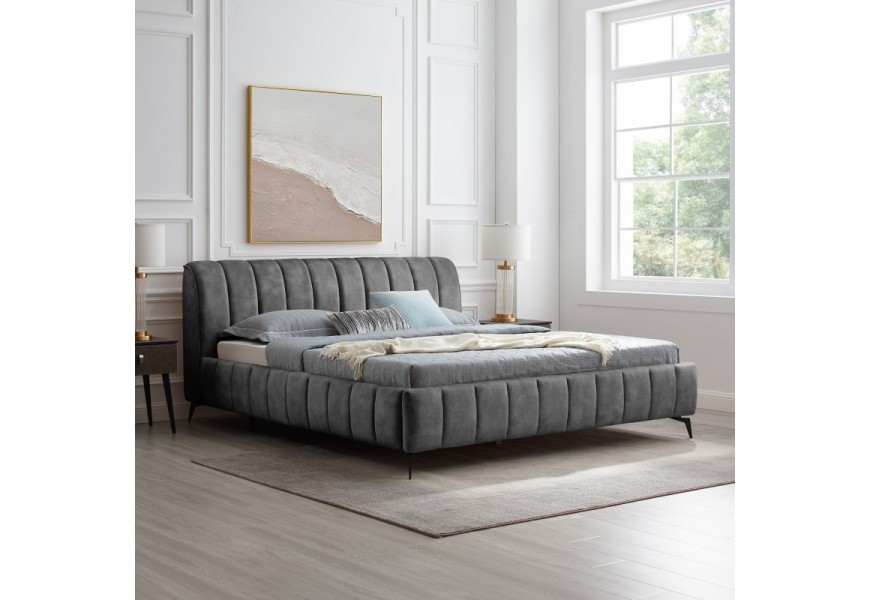 Dizajnová manželská posteľ Orlando je nádherným kúskom, ktorý elegantne doplní priestory art deco či moderných spální. Posteľ zaujme svojím nadčasovým prevedením a moderným vzhľadom, a zamilujete si ju tiež vďaka jej pohodlnosti a výbornej kombinovateľnosti. Disponuje príjemným zamatovým poťahom v tmavosivej farbe, ktorý zdobí elegantné prešívanie vytvárajúce moderný vzhľad. Čalúnené telo dopĺňajú jednoduché čierne nožičky z kovu s jemným industriálnym nádychom. Posteľ Orlando krásne doplnia drevené či kovové nočné stolíky či šatníkové skrine v modernom štýle. Vhodné sú tiež textílie v svetlých zemitých alebo pastelových odtieňoch a doplnky z kovu či skla. Vytvorte si aj vy vo svojej spálni luxusný moderný nádych s posteľou Orlando a spríjemnite si chvíle spánku a večernej pohody!