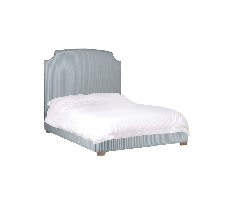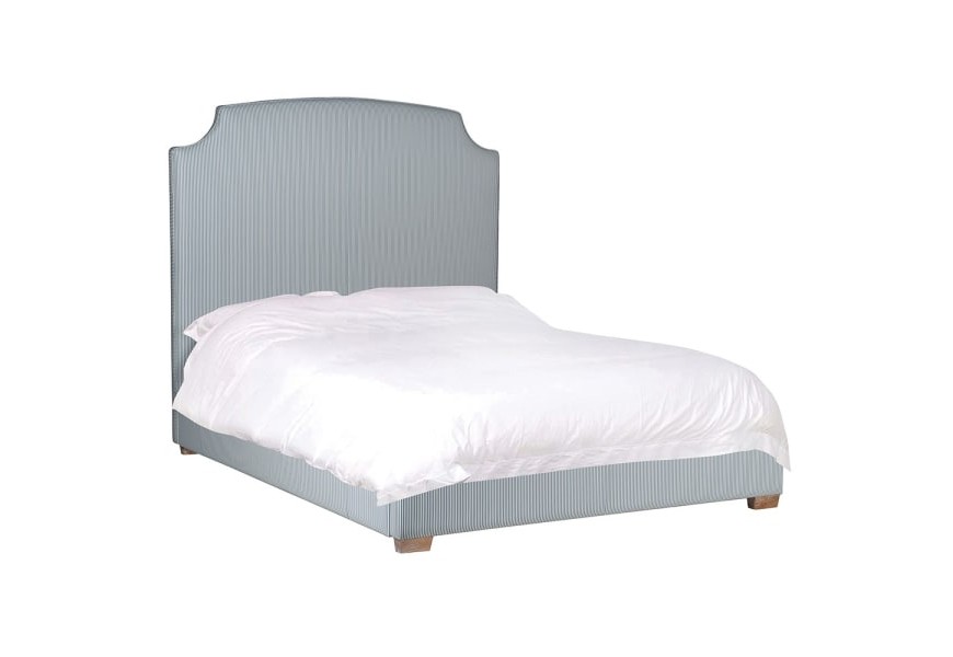 Retro štýlová manželská posteľ Acara s modrým prúžkovaným poťahom a vysokým vykrojeným čelom 194cm