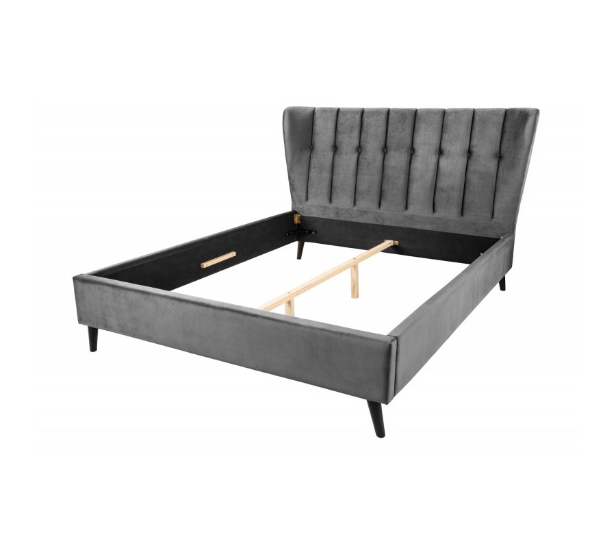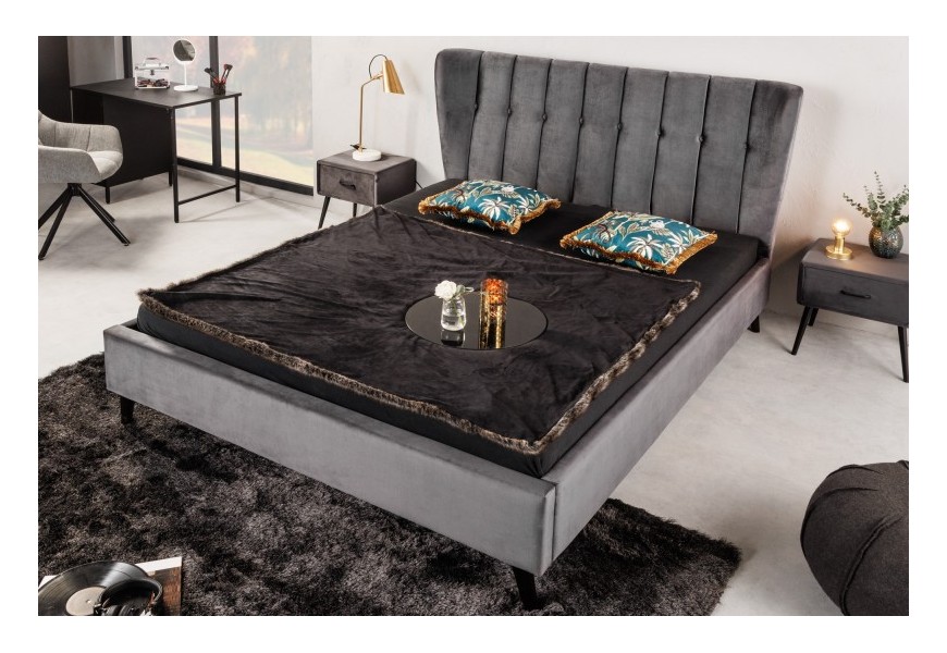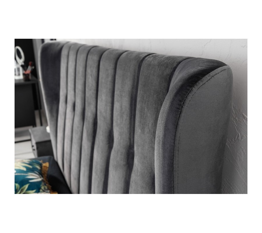 Štýlová manželská posteľ Alva Vás zaujme svojím jedinečným dizajnom, ktorý prinesie retro vzhľad v modernom prevedení priamo do vašej spálne. Manželská posteľ Alva disponuje príjemným zamatovým čalúnením v tmavosivej farbe, ktoré je obohatené o vertikálne prešívanie s dizajnovými gombíkmi na 120cm vysokom, zadnom, jemne zaoblenom čele postele. Tmavá dizajnová stránka je v neposlednom rade doplnená šikmými čiernymi nožičkami z eukalyptového dreva. Na štýlovú posteľ Alva je vhodný matrac s rozmerom 160x200cm, ktorý udržia lamelové rošty so stredovým nosníkom. Manželská posteľ Alva vynikne najmä v kombinácií s tmavším nábytkom so šikmými nožičkami, s nábytkom v nádychu retro štýlu, a taktiež s kovovými doplnkami. Posteľ je dodávaná bez matracu a roštu.