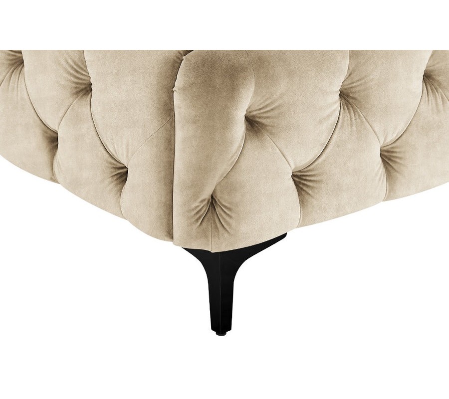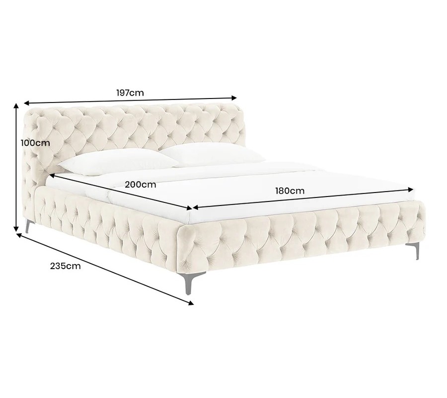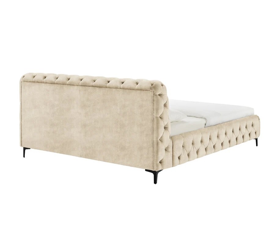 Posteľ je čalúnená kvalitným zamatovým poťahom v béžovom odtieni šampanského, ktorý pôsobí mimoriadne jemne, hrejivo a luxusne zároveň. Zamat je príjemný na dotyk a v závislosti od dopadu svetla vytvára elegantné odlesky, vďaka čomu posteľ krásne vynikne v elegantne a luxusne ladených interiéroch. Stabilnú konštrukciu dopĺňajú štíhle kovové nožičky v čiernej farbe, ktoré vytvárajú moderný kontrast k jemnému čalúneniu, zabezpečujú pevnú stabilitu a zároveň umožňujú jednoduchšie čistenie pod posteľou.