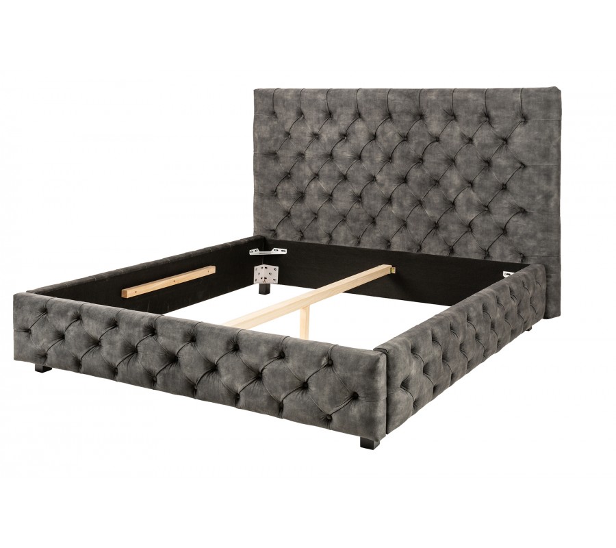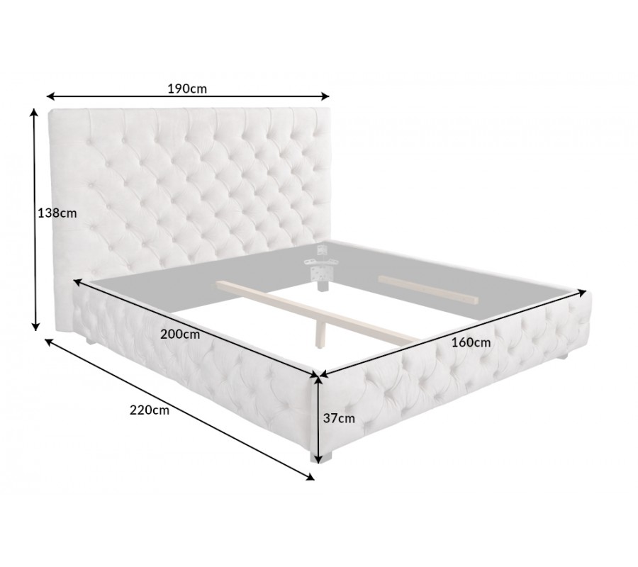 Luxusná posteľ Kreon so zamatovým čalúnením bude dizajnovým vrcholom vašej spálne. Posteli vizuálne dominuje čelo s výškou 138 cm a nezameniteľným prešívaním v štýle Chesterfiel, ktoré nájdete tiež na obvode spodnej časti postele s výškou 37 cm. Dekoratívne hlboké gombíky v kombinácii s príjemným zamatovým materiálom dodávajú posteli nádych luxusu viktoriánskej éry, v ktorej bol nábytok v štýle Chesterfield znakom bohatstva a vyššej vrstvy. Do modernej spálne však posteľ Kreon predurčuje zamatové čalúnenie v elegantnom sivom odtieni a a rovné línie definujúce jej tvar. To všetko dopĺňajú hranaté čierne nožičky vo výške 16 cm. Posteľ môžete kombinovať s moderným nábytkom v neutrálnych farbách s rovnými líniami či farebnými doplnkami. Posteľ má stabilný drevený stredný nosník a takisto je možné do rámu vložiť lamelové rošty. Pohodlne sa vyspíte na ploche v rozmere 160x200 cm.