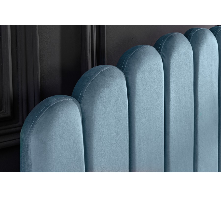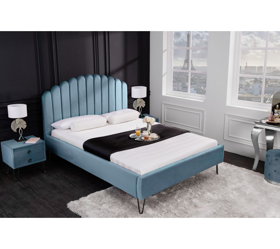 Štýlová manželská posteľ Aquamarine je kúskom, ktorý bude dominovať každej art deco či modernej spálni. Svojím pútavým dizajnom zaujme všetkých tých, ktorí majú radi nadčasové kúsky s nádychom elegancie. Posteľ disponuje jemným svetlomodrým poťahom zo zamatu, ktorý rozžiari vašu miestnosť. Zaujímavým prvkom je tiež lastúrový tvar čela zložený z jednotlivých zaoblených vertikálne delených častí. Moderný nádych do dizajnu postele Aquamarine vnášajú jednoduché čierne nožičky z kovu, ktoré zároveň zjednodušujú prístup. Posteľ s rozmermi 140x200 centimetrov je ideálna pre páry alebo jednotlivcov, ktorí si radi doprajú nadštandardný komfort. Je preto skvelým kúskom na zariadenie spální, ale i hosťovských izieb či dizajnových hotelových izieb. Posteľ Aquamarine vytvorí dokonalú kombináciu s rovnomenným nočným stolíkom v svetlomodrej farbe, rovnako ako aj s kontrastnými dekoráciami a doplnkami s kovu či skla. Art deco vzhľad v svojich priestoroch umocníte doplnením lesklého nástenného zrkadla, kovovej zlatej či striebornej nočnej lampy alebo koberčekom s dlhým vlasom.