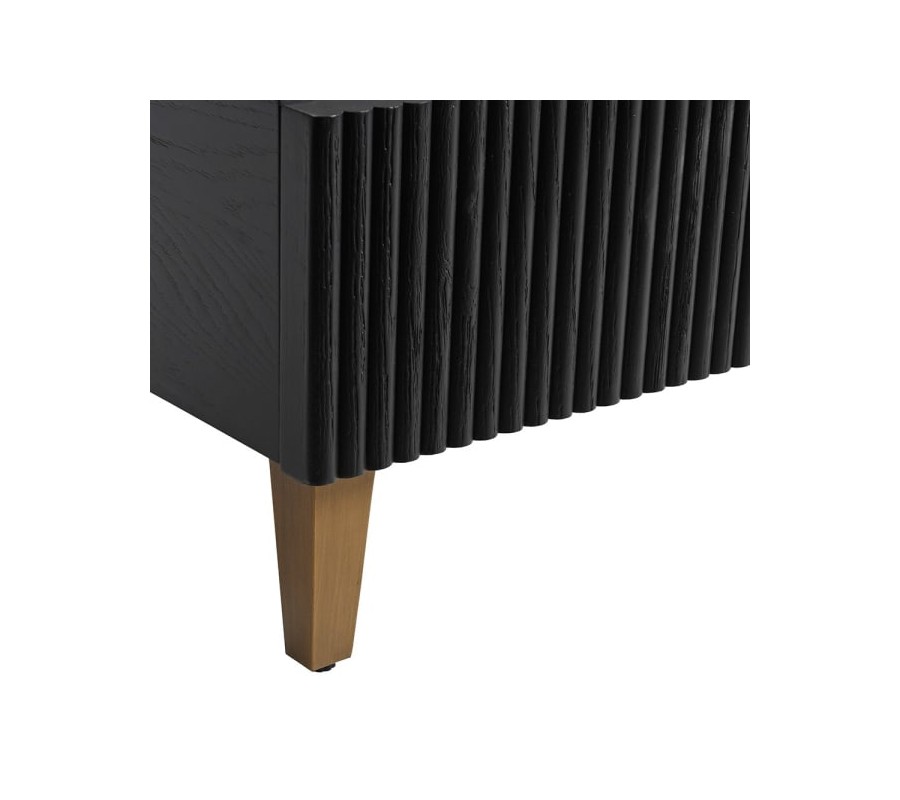 Čelo je dominantným prvkom dizajnu a stane sa kľúčovým dekoračným prvkom celej miestnosti. Kombinácia lineárnych lamiel s horizontálnou a vertikálnou orientáciou vytvára trojuholníkový vzor. Sofistikovaný dizajn podčiarkuje elegantné čierne lakovanie. Geometrické vzory sú inšpirované art deco estetikou, rovnako ako aj zlatá farba nožičiek. Tento lesklý metalický element vytvára luxusný farebný akcent.