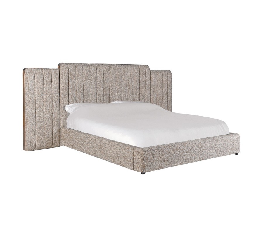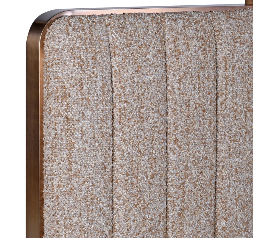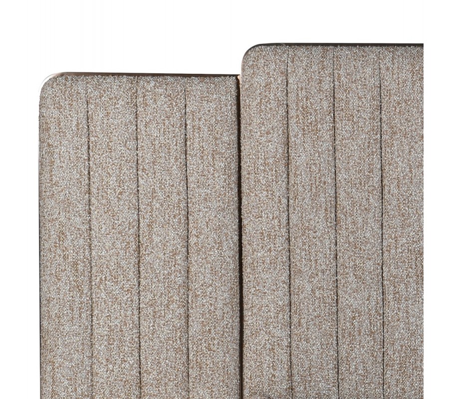 Čelo pokrýva mäkká penová výplň, zdôrazňujúca elegantné oblé tvary a zdobí ho vertikálne lineárne prešívanie. Tento geometrický vzor sa výborne prepája so symetrickým tvarom a podčiarkuje art deco estetiku. Textilný poťah je vďaka elegantnej buklé štruktúre príjemný na dotyk a mikrovlákno mu zaručuje výbornú odolnosť voči vplyvom každodenného používania. Béžové melírované prevedenie spája svetlé a tmavšie odtiene a výborne sa prepája s teplou medenou farbou rámu. Posteľ tak pôsobí vďaka dizajnovému čelu štýlovo, no zároveň aj teplo a útulne.