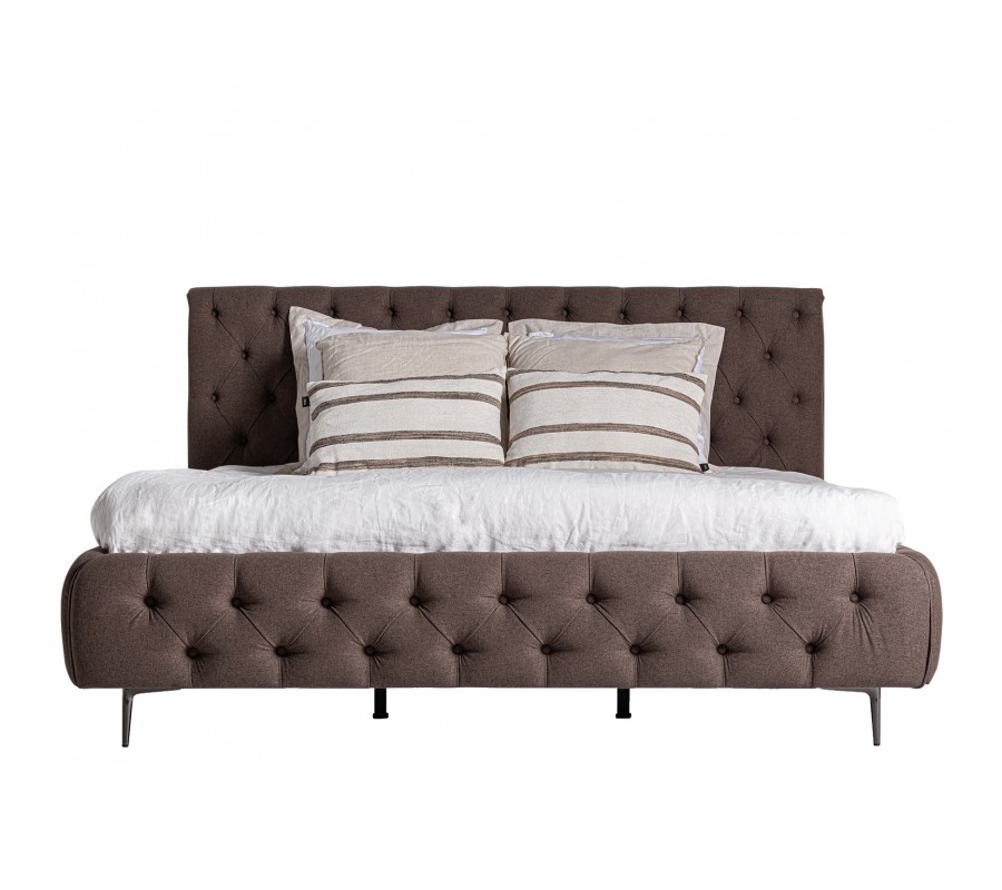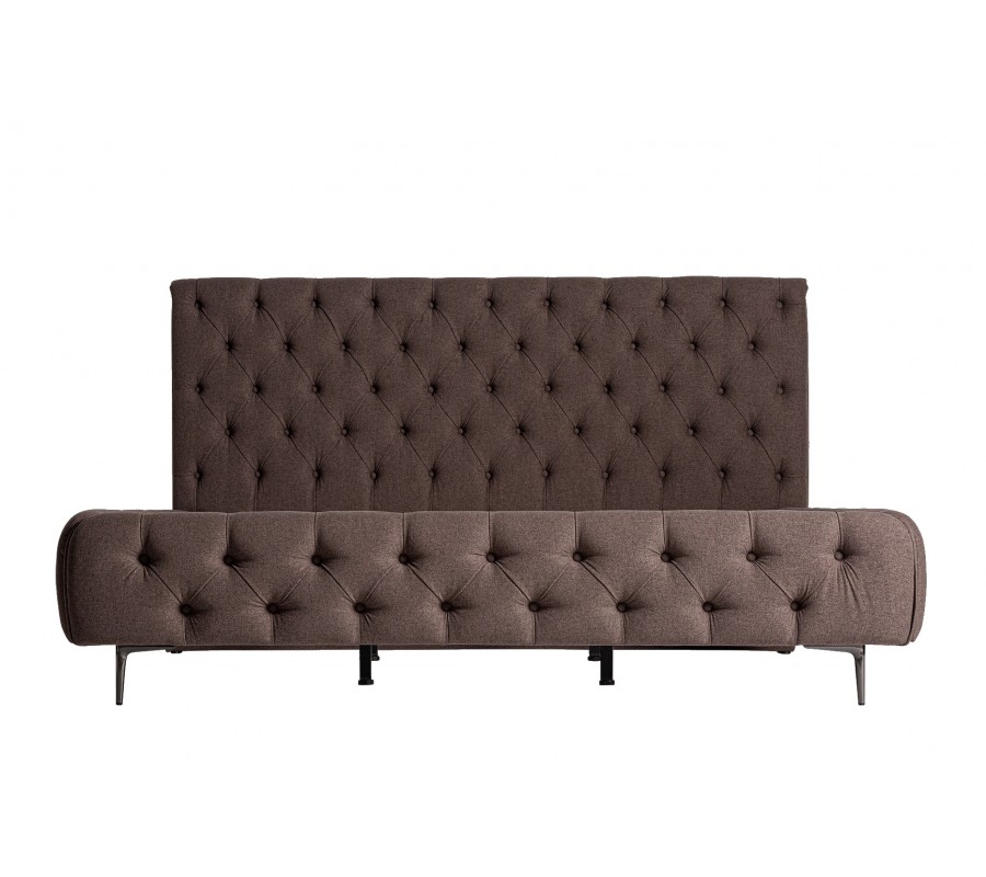 Luxusná chesterfield hnedá čalúnená posteľ Mia s prešívaním a vysokým čelom a kovovými nožičkami 223 cm