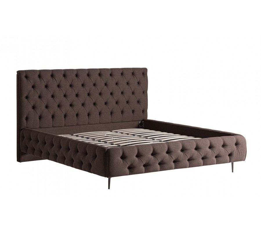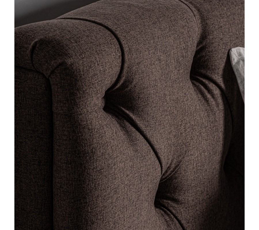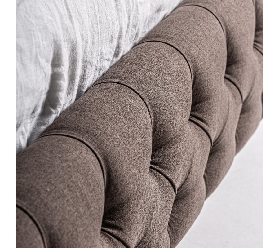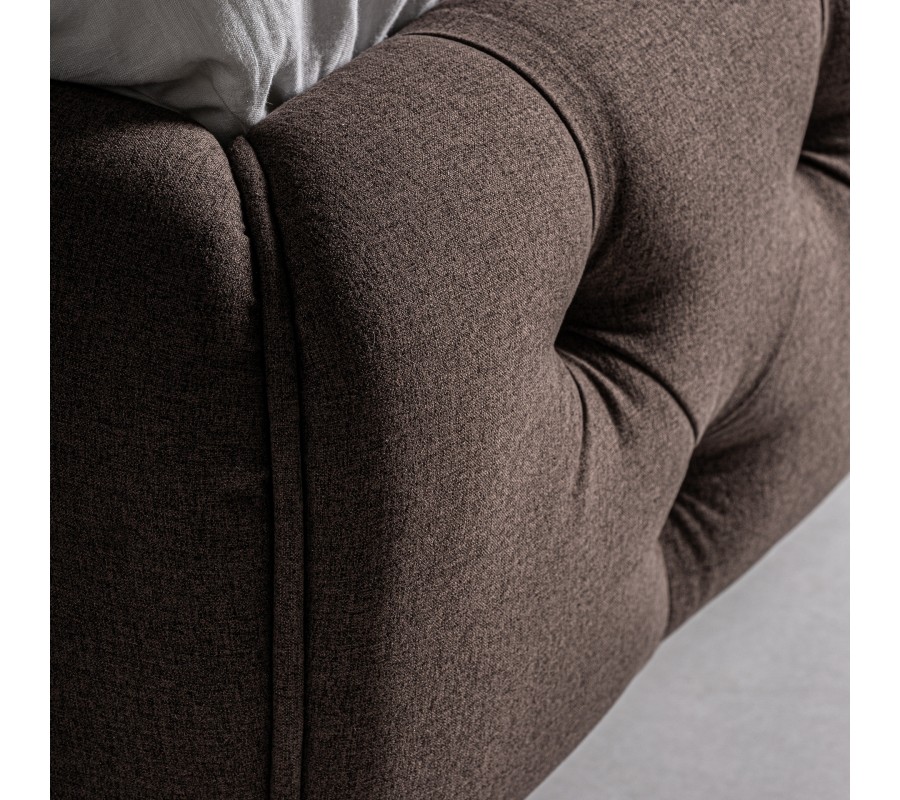 Luxusná čalúnená posteľ Mia je stelesnením nadčasovej elegancie a remeselného majstrovstva. Jej ikonický vzhľad s vysokým čelom vyniká chesterfield prešívaním s hlbokými záhybmi a ozdobnými gombíkmi, ktoré vytvárajú mäkký, plastický efekt. Poťah v hnedom odtieni je vyrobený z kvalitného mikrovlákna, ktoré je na dotyk jemné, no zároveň pevné a odolné voči opotrebeniu.