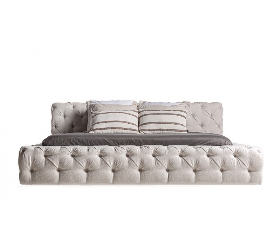 Luxusná moderná čalúnená manželská posteľ Perivolos so svetlým béžovým poťahom a chesterfield prešívaním 227 cm