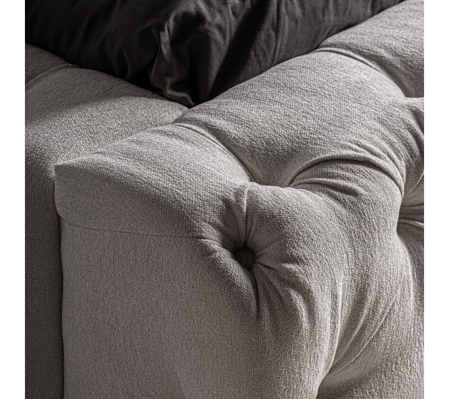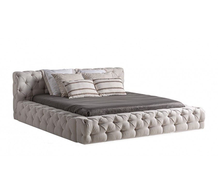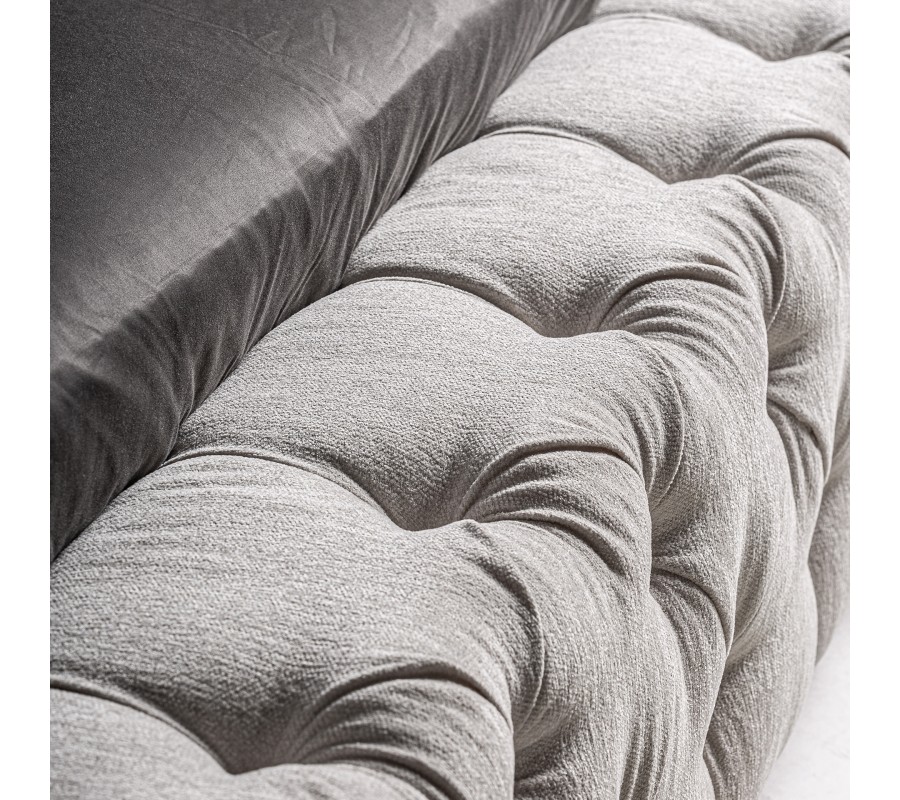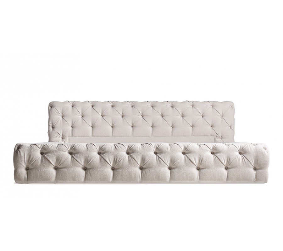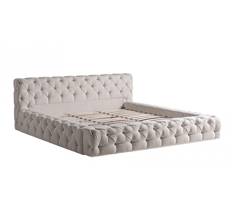 Posteľ má hranatú siluetu s obdĺžnikovým čelom a hrubými okrajmi okolo lôžka. Dizajnu dominuje výrazné prešívanie v chesterfield štýle s hlbokými okrúhlymi gombíkmi. Záhyby v látke vytvárajú diamantový vzor a celé čalúnenie tak pôsobí honosným a luxusným dojmom, s nádychom klasickej elegancie.