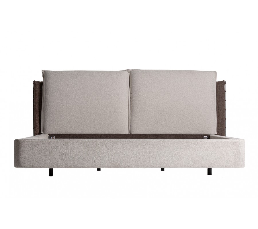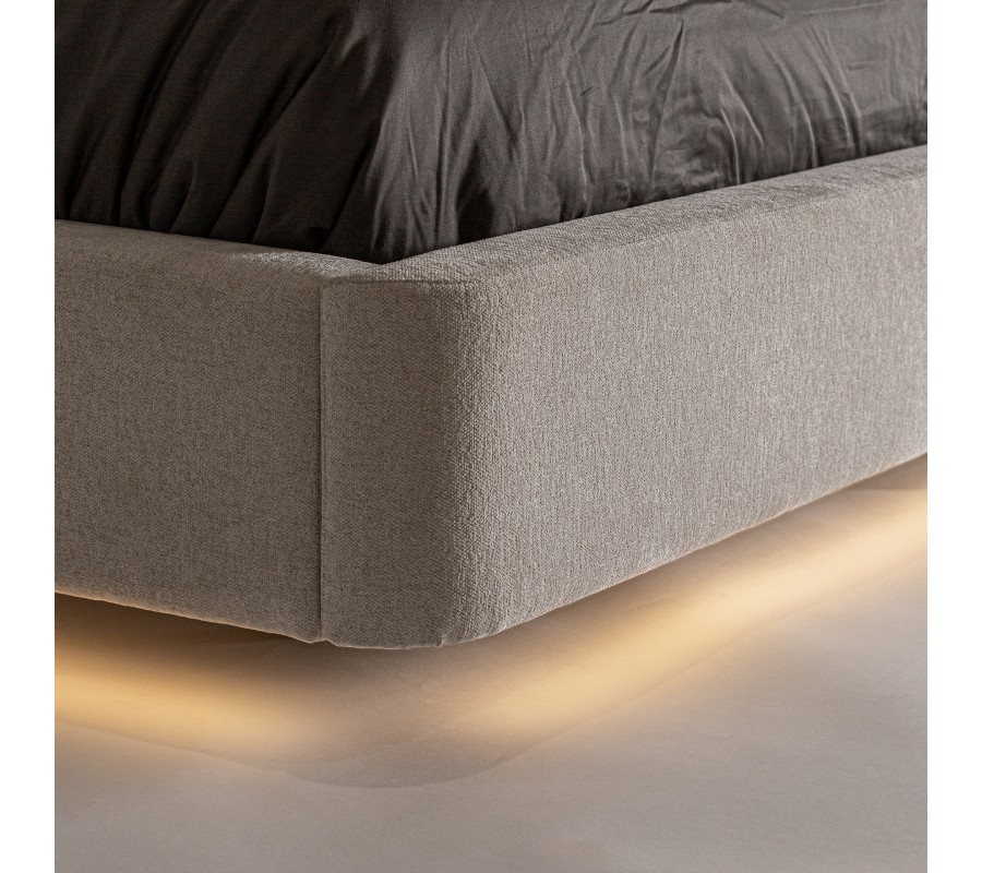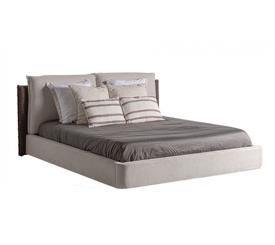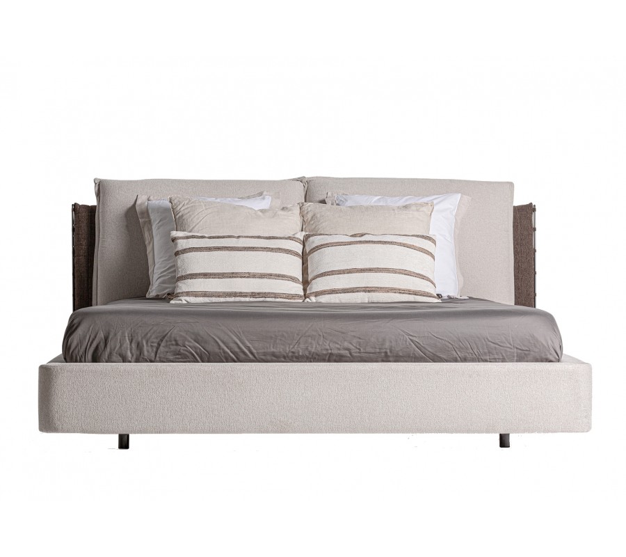 Z prednej strany sú na čele upevnené dva obdĺžnikové vankúše, ktoré ho vizuálne predeľujú na dve časti. Majú výrazne prešívaný okraj a čiastočne odhaľujú hnedú zadnú vrstvu. Poťah v svetlej sivej farbe má jemnejšiu štruktúru a pokrýva tiež základňu postele, ktorá má výrazne zaoblené rohy. Posteľ stojí na čiernych kovových nožičkách, ktoré sú diskrétne integrované do rámu a základňa tak pôsobí elegantným plávajúcim dojmom.
