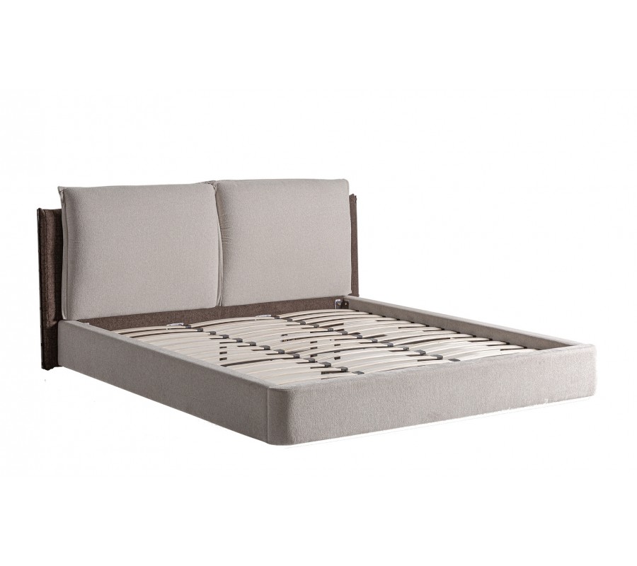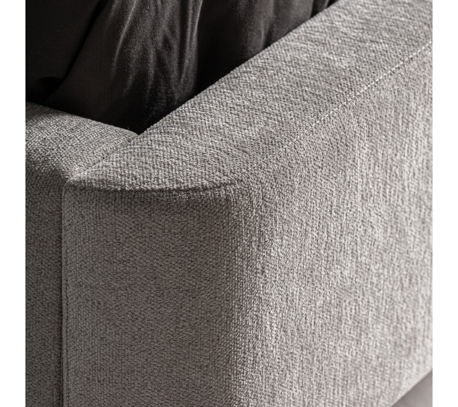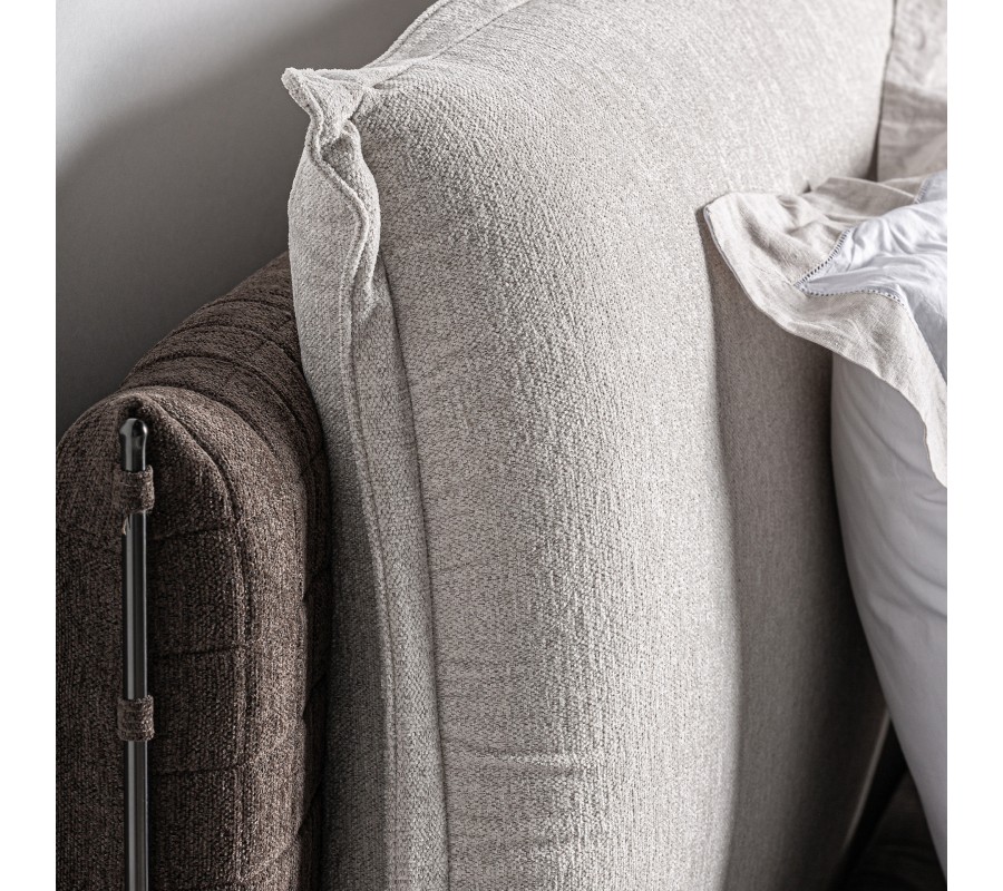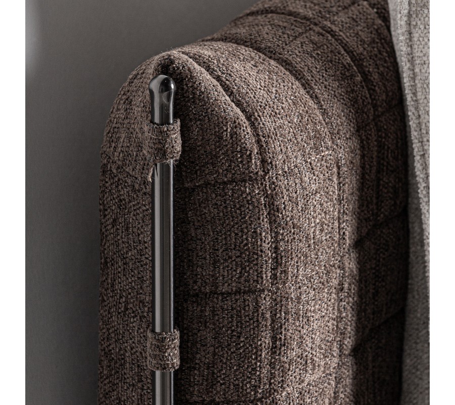 Posteľ má minimalistický dizajn s prepracovanými detailmi, ktoré mu dodávajú sofistikovaný charakter. Čelo postele je dvojvrstvové. Zadná strana zaberá celú výšku a je potiahnutá textíliou v hnedej farbe s geometrickým štvorcovým prešívaním. Výrazné tkanie a melírované vlákno vytvára príjemný zemitý vizuál, ktorý krásne kontrastuje so zvyškom čalúnenia. Na bokoch je umiestnený vertikálny lesklý chrómový detail v sivej farbe, upevnený slučkami z poťahovej látky.