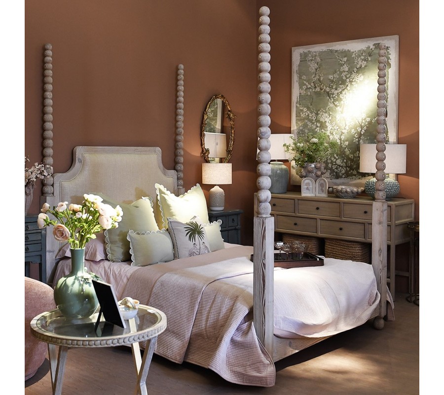 Manželská posteľ Boia je ideálnou voľbou do spálne zariadenej vo vidieckom štýle, kde ju môžete doplniť textíliami a bielizňou s elegantnými florálnymi vzormi či nočnou lampou s keramickou podstavou. Hodí sa k nej aj nočný stolík s patinovanou povrchovou úpravou vo vintage štýle či komoda s vyrezávaným zdobením s bieleného dreva. Do priestoru prinesie luxusný dominantný prvok, ktorý zároveň pôsobí teplým prírodným dojmom.