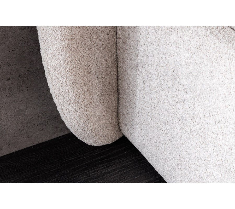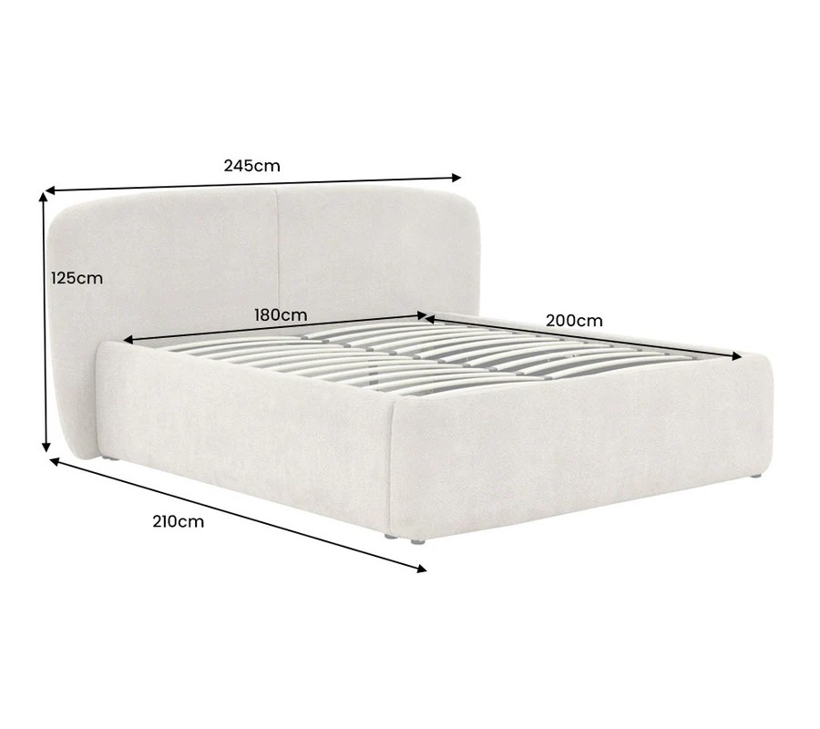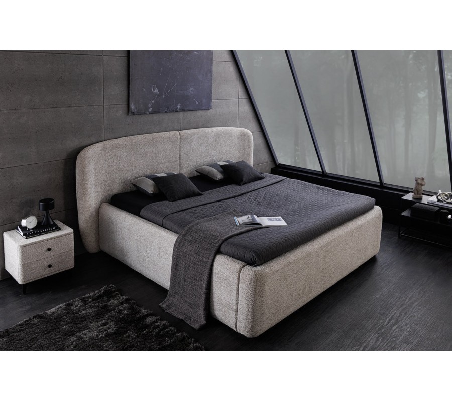 Dominantným prvkom je široké čelo postele so zaoblenými vrchnými hranami. Jeho oblý tvar navodzuje harmonický dojem a zároveň pôsobí mäkko na pohľad aj dotyk. Bočné aj spodné hrany postele plynulo nadväzujú na čalúnenie bez ostrých liniek, takže celok pôsobí kompaktným dizajnovým dojmom. Tento typ tvarovania a poťahu je výhodný aj z hľadiska bezpečnosti – najmä v domácnostiach s deťmi, kde zaoblené časti znižujú riziko úrazu.