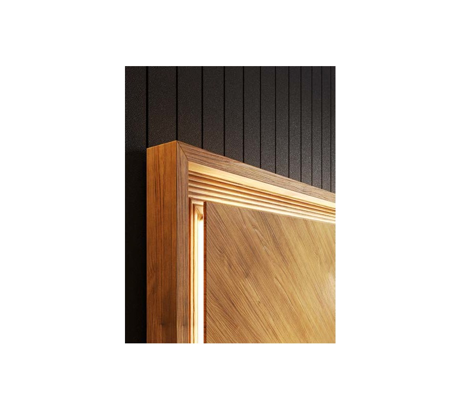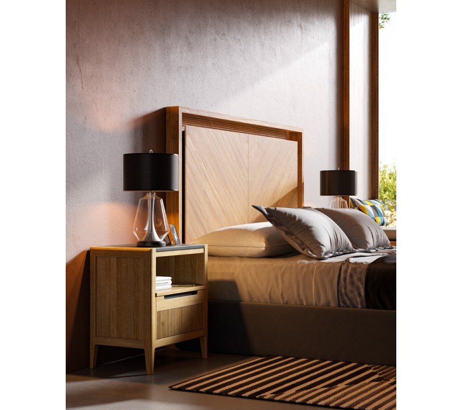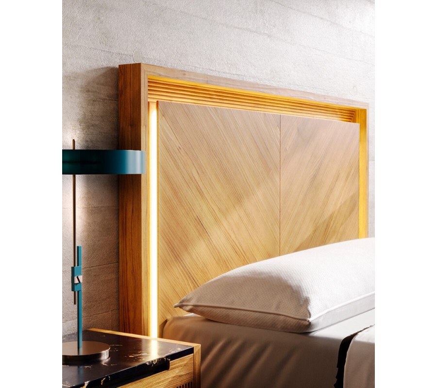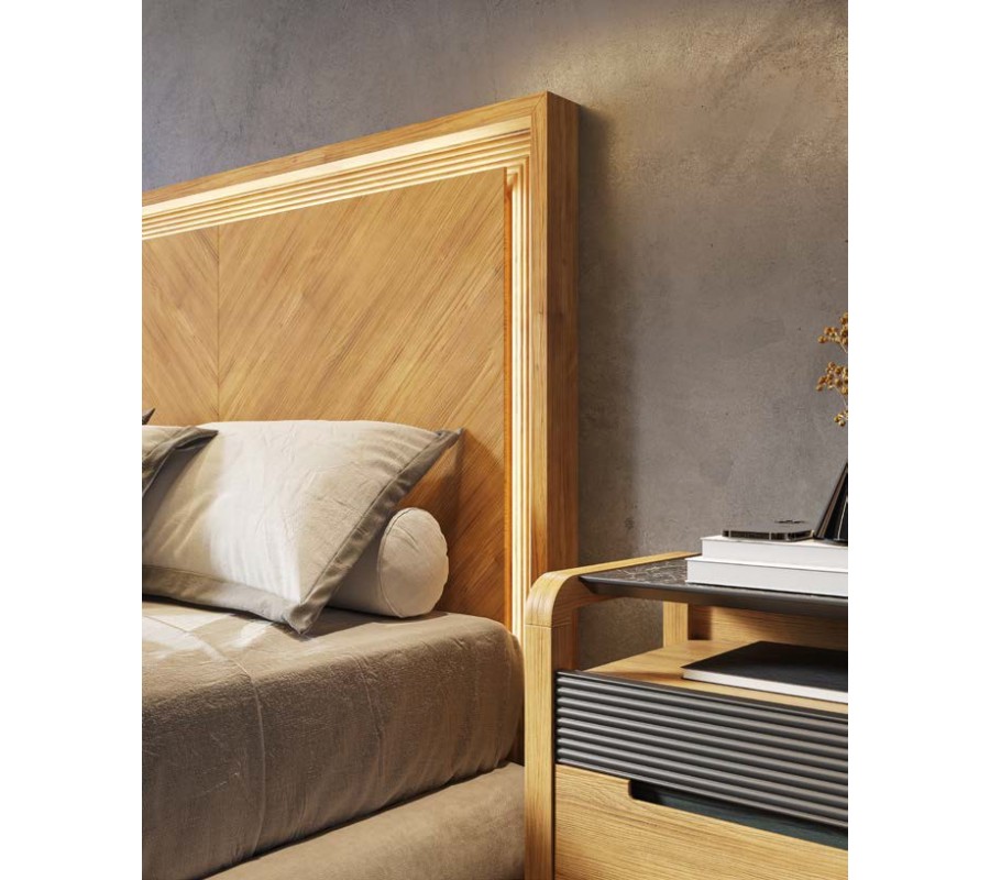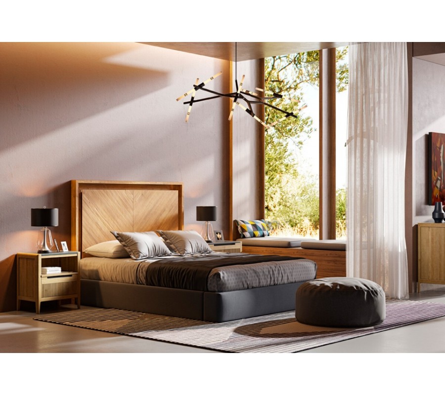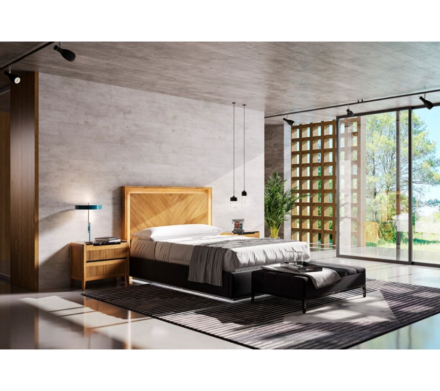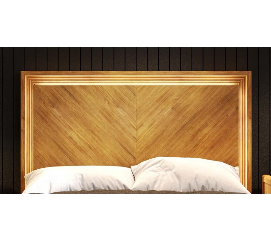 Dominantným prvkom je obdĺžnikové drevené čelo z masívneho dreva s možnosťou prevedenia s jemným rybím vzorom s dekoratívnym radovým vyrezávaním po obvode, ktoré zvýrazňuje architektonický charakter nábytku. Posteľ je dostupná v rozmeroch pre matrac 135 cm so šírkou čela 154 cm, 150 cm so šírkou čela 169 cm a 180 cm so šírkou čela 199 cm.