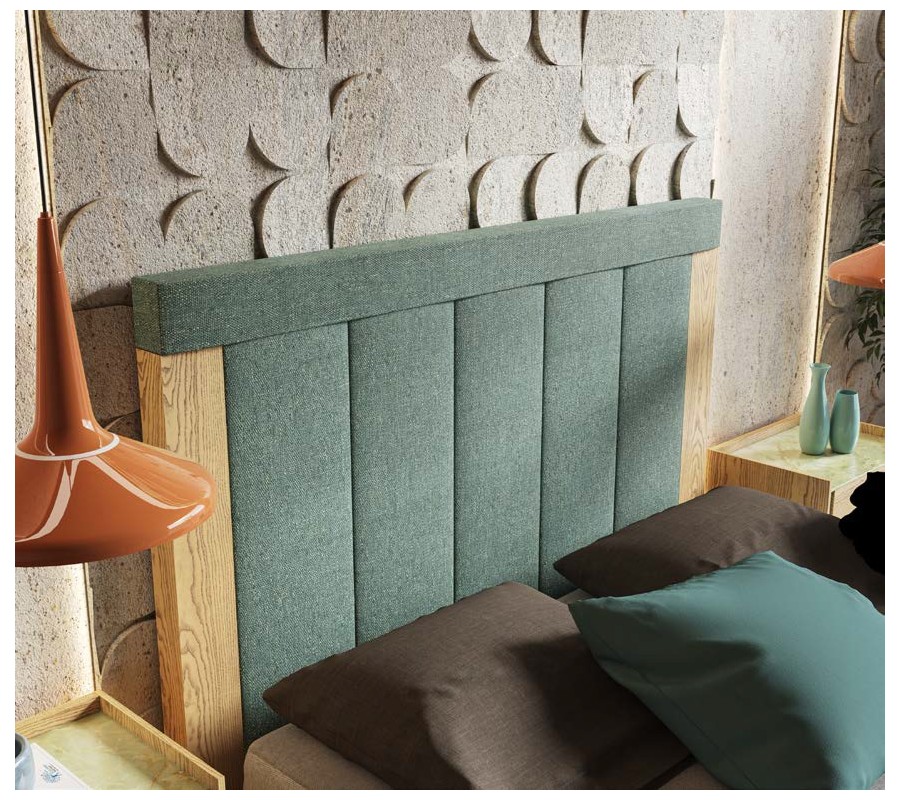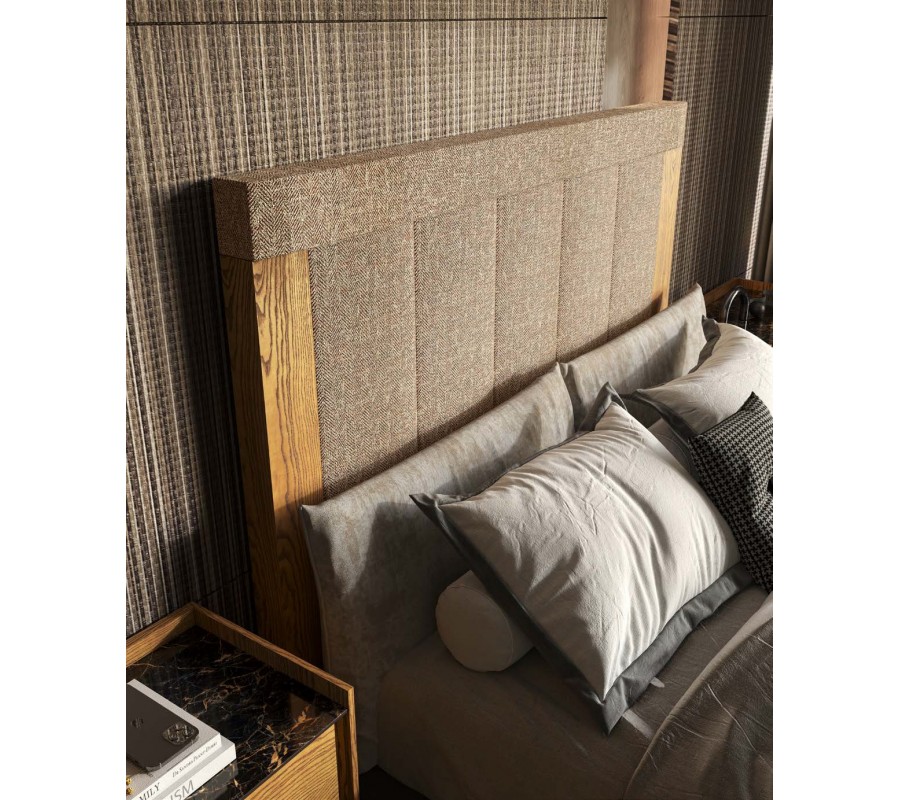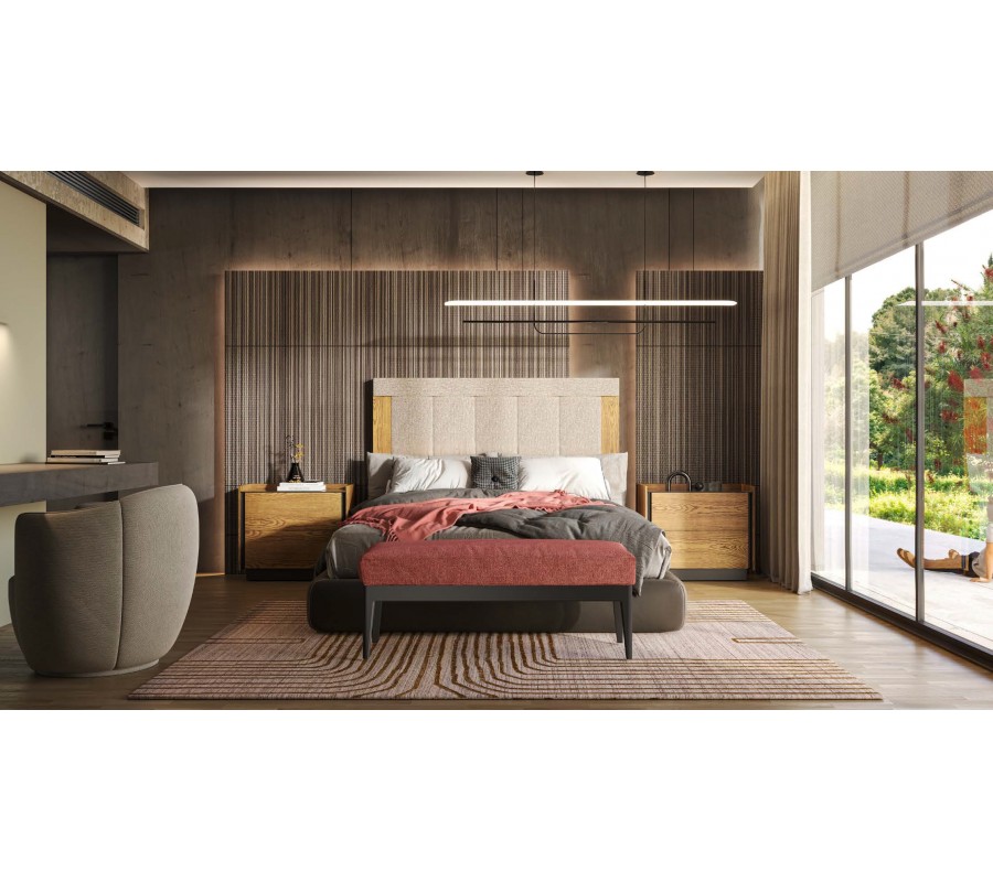 Luxusná manželská posteľ Praga predstavuje spojenie moderného dizajnu, masívneho dreva a precízneho čalúnenia. Robustná drevená konštrukcia je obohatená o čalúnený rám, ktorý vytvára komfortný základ pre kvalitný spánok. Dominantným prvkom je čelo postele s prešívaním rozdeleným do piatich samostatných panelov, pričom po bokoch je priznaná drevená konštrukcia, ktorá zvýrazňuje architektonický charakter celej zostavy. Posteľ nemá nožičky a stojí na celistvej podstave, vďaka čomu pôsobí kompaktne a moderne.