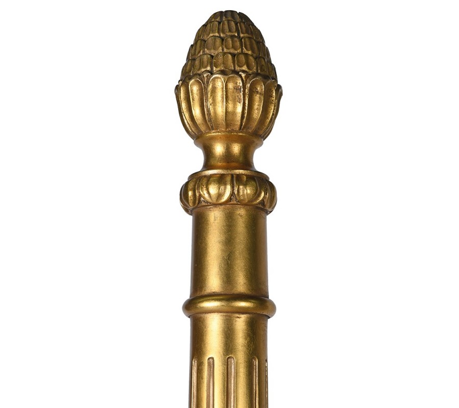 Dominantným prvkom postele sú bohato vyrezávané nožičky a vertikálne tyče, ktoré plynulo prechádzajú až nad čelo postele do výšky 220 cm. Ich horné zakončenie tvorí detailne vyrezávaný motív artičokov, typický pre klasický a glamour štýl, ktorý dodáva posteli honosný a dekoratívny vzhľad. Spodné nožičky sú štíhle, elegantné a jemne zaoblené, rovnako ako celé línie konštrukcie, vďaka čomu posteľ nepôsobí ťažkopádne, ale vyvážene a ladne.