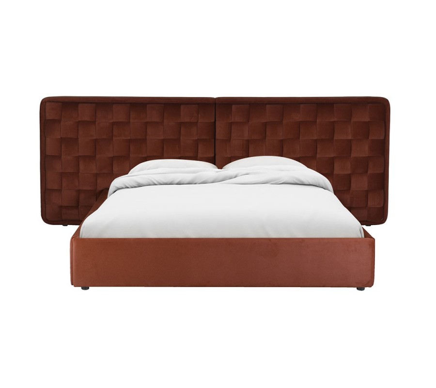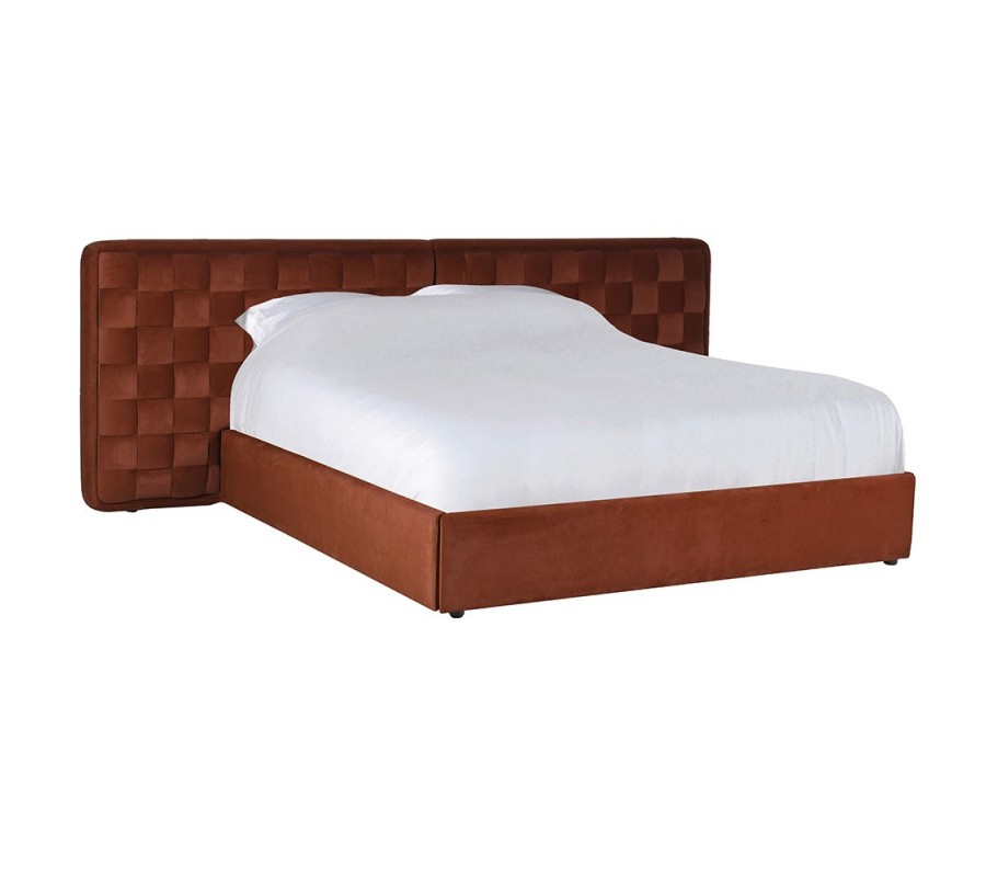 Luxusná retro čalúnená posteľ Super King s prepleteným štvorcovým vzorom v tehlovo hnedom odtieni na nízkych nožičkách 305 cm