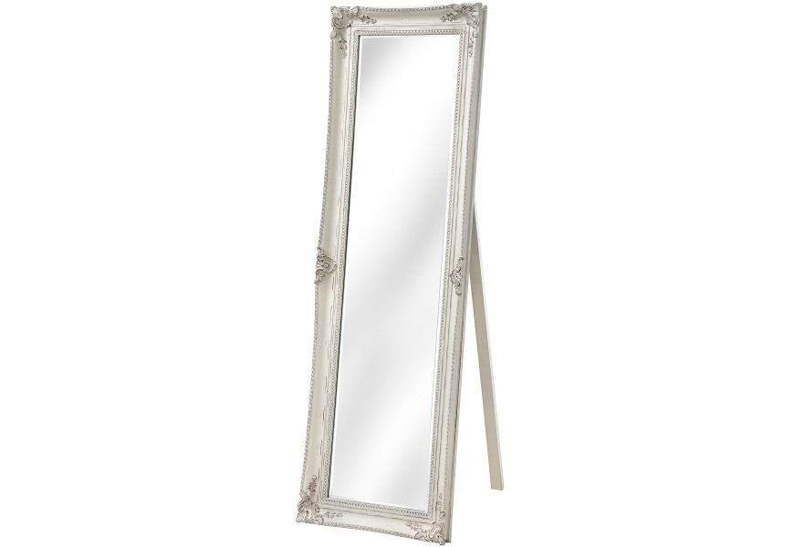 Štýlové šatníkové zrkadlo FRANCAIS v bielom prevedení je unikátnym a výrazným kusom nábytku hodiacim sa predovšetkým do honosne zariadených spální a šatníkov. Masívnemu, bohato dekorovanému rámu dodáva vzhľad luxusného, starožitného nábytku výrazná patina.