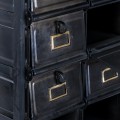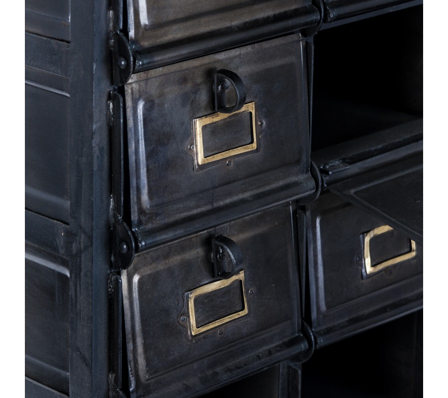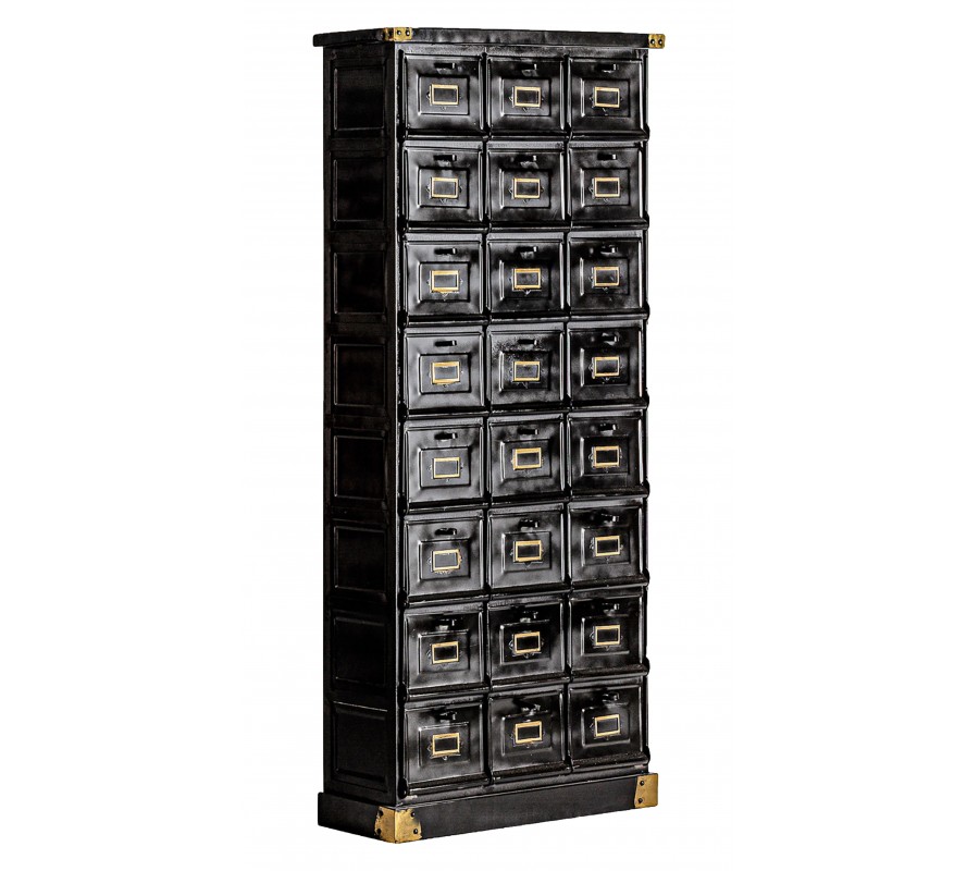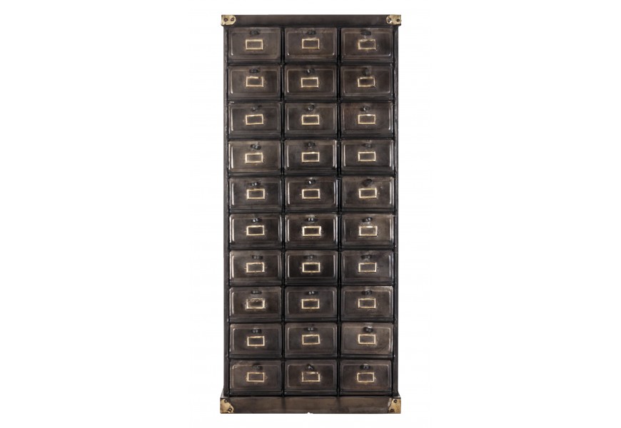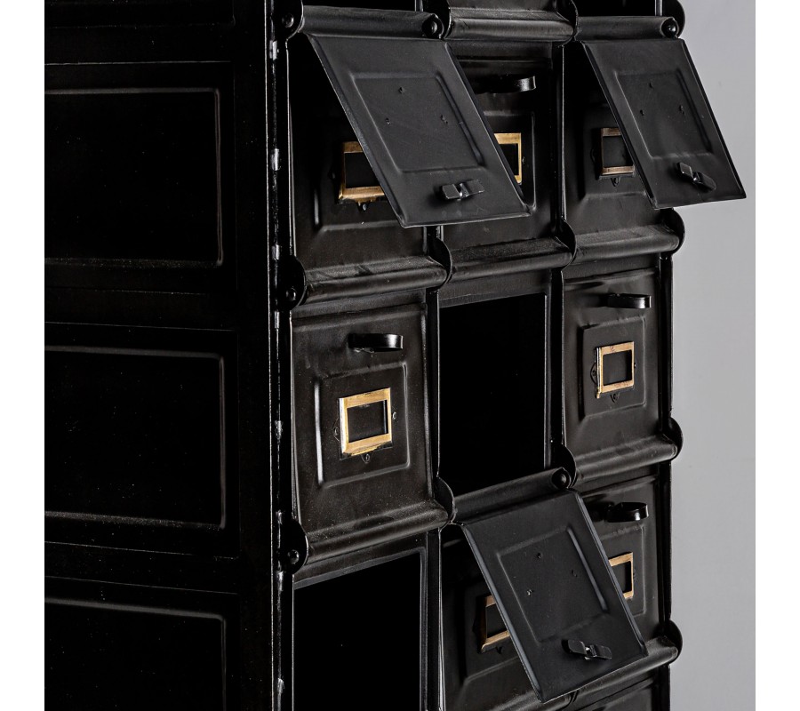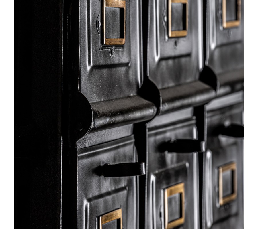 Celá skrinka je vyrobená z pevného kovu s lesklým čiernym povrchom, ktorý bol povrchovo upravený tak, aby zostala zachovaná jemná industriálna patina, teda mierne nerovnomerné zafarbenie, ktoré zvýrazňuje remeselné spracovanie. Každé z dvadsiatich štyroch samostatných dvierok má vyklápací mechanizmus smerom dopredu a je doplnené mosadznou menovkou v starozlatej farbe, ktorú možno použiť na označenie obsahu priehradky. Na prednej strane sa nachádza aj praktická čierna úchytka v oblúkovom tvare, umiestnená centrálne, čo uľahčuje každodenné používanie.