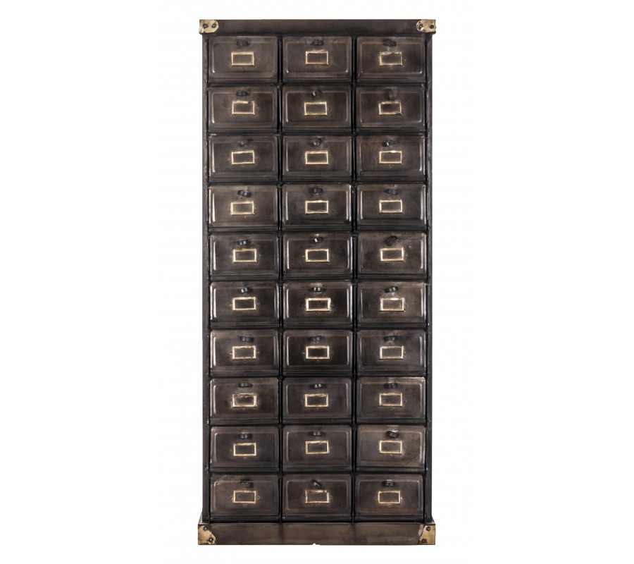 Industriálna úschovňa Andres je originálny úložný kus s výrazným charakterom, inšpirovaný historickými kartotékami a archívnymi skrinkami z tovární či starých dielní. Vysoká a úzka konštrukcia s výrazným vertikálnym členením pôsobí dominantne a výborne zapadá do interiérov, ktoré hľadajú autentickosť a silný dizajnový prvok.