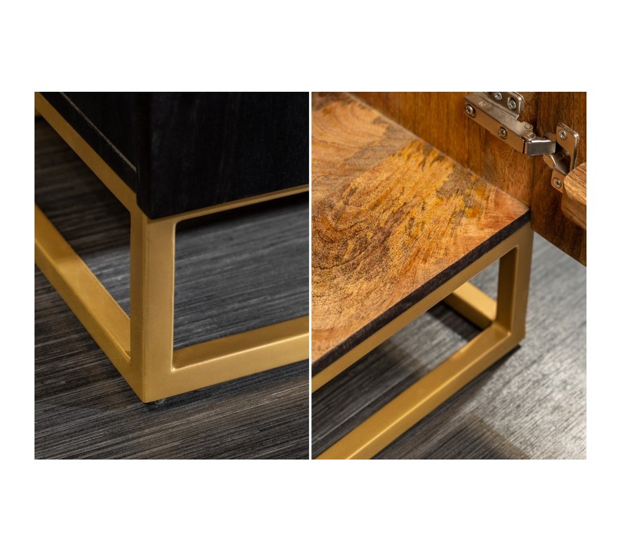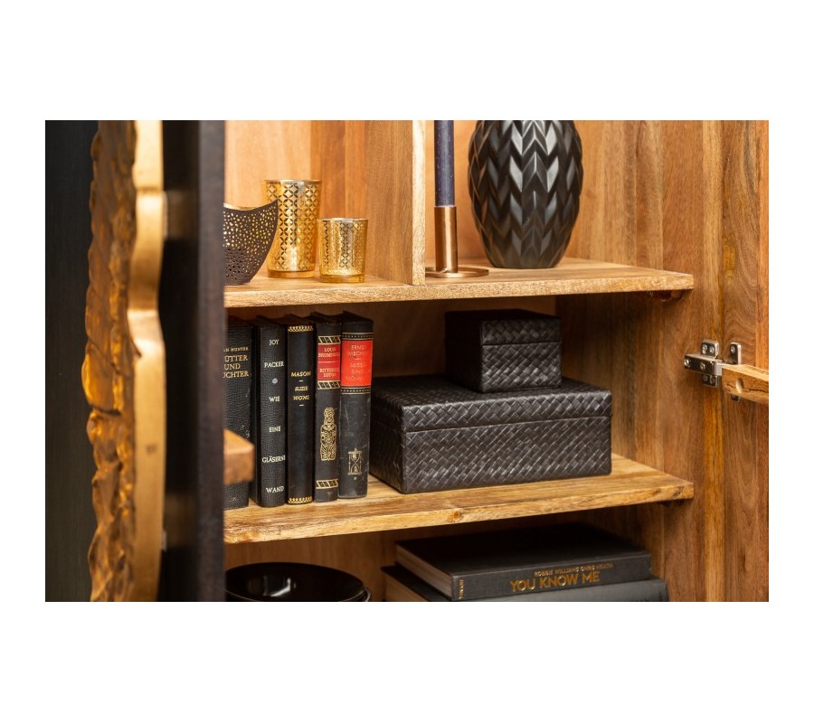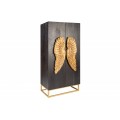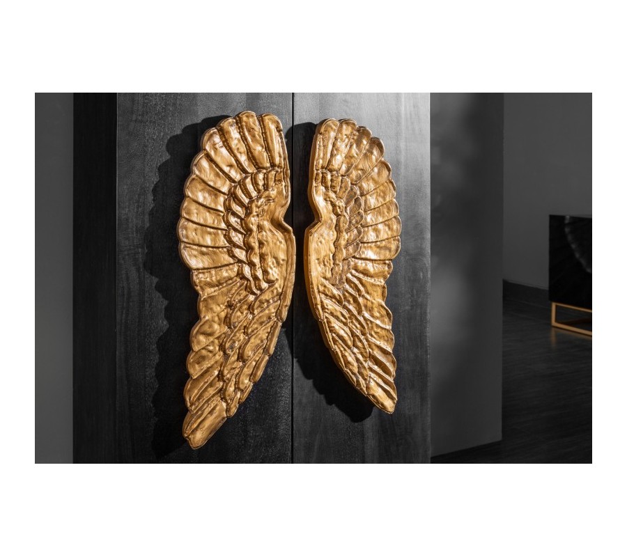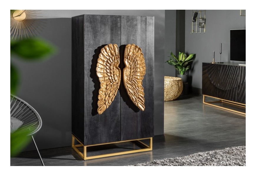 Štýlová skriňa Seraphic je dizajnovým kúskom, ktorý vynikne v každej luxusnej spálni. Skvelo zapadne do art-deco ladených priestorov alebo interiérov, ktoré potrebujú výnimočný a dominantný kúsok. Skriňa je vyrobená z masívneho dreva v čiernej farbe, ktoré je kombinované zlatou kovovou podstavou. Zaujímavým prvkom sú zlaté anjelské krídla, ktoré zároveň slúžia ako úchyty na dverách skrine. Vo vnútri je farba dreva hnedá a nachádza sa tu viacero poličiek, ktoré poskytnú dostatok úložného priestoru pre vaše šatstvo či iné predmety. Skriňa Seraphic zapadne do svetlých i tmavých interiérov a odporúčame ju doplniť dekoráciami z kovu či inými art-deco prvkami.