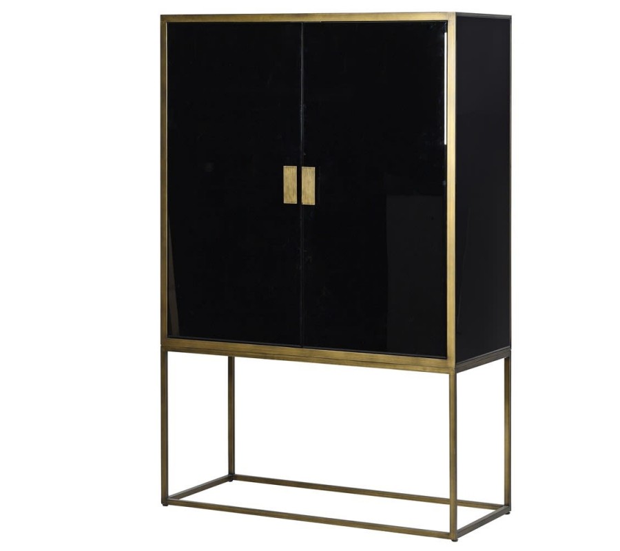 Art-deco zrkadlová vysoká skrinka Erin v čiernej farbe so zlatou kovovou konštrukciou 178cm