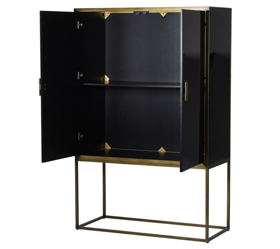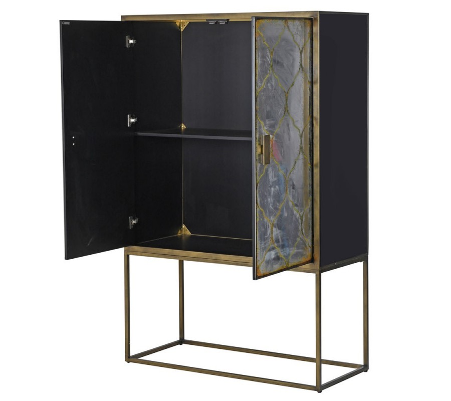 Jedinečná skrinka Erin sa nesie v luxusných čierno-zlatých odtieňoch. Disponuje dvomi poličkami s dvierkami, ktoré ochránia vaše predmety pred prachom a znečistením. Dvierka sú vyrobené z MDF a skla so zrkadlovým efektom, ktorý vytvára dizajnovú kombináciu s vysokou zlatou kovovou konštrukciou a úchytmi na dvierkach. Skrinka Erin zapadne do moderných art-deco ladených priestorov ladených v tmavších tónoch. Odporúčame taktiež kombináciu s ďalšími zrkadlovými či kovovými kúskami v zlatých odtieňoch.