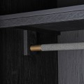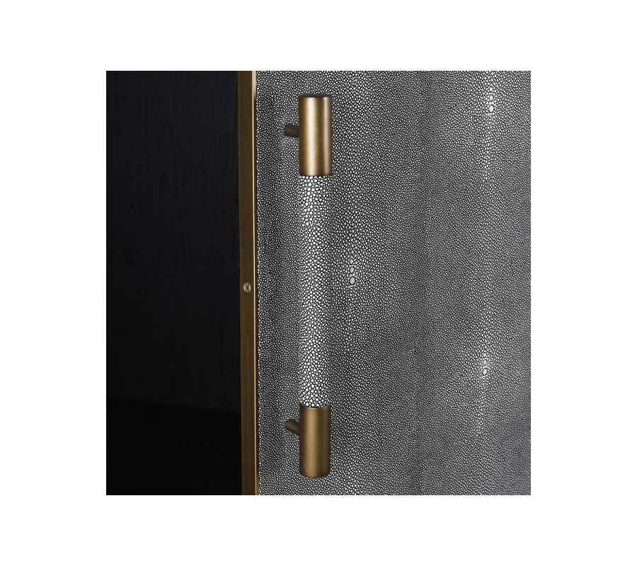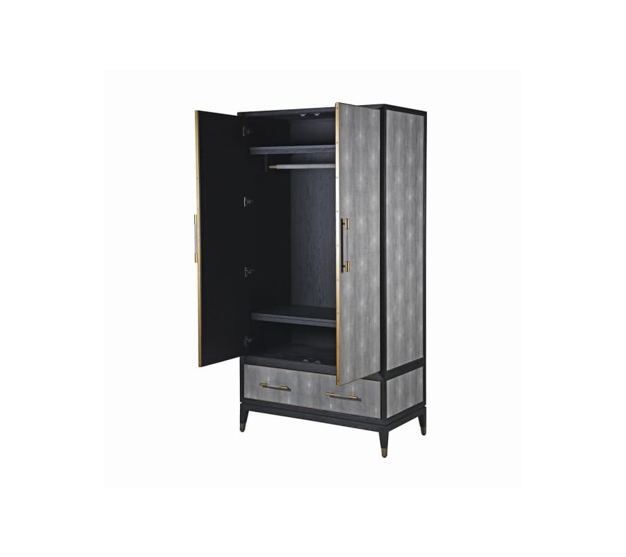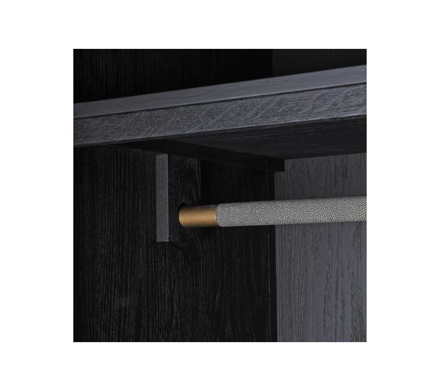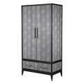 Dizajnová art-deco skriňa z našej kolekcie Otawa, očarí vkusnou kombináciou surovej eko-kože, dreveného masívu a kovových prvkov. Skriňa je vyrobená z masívneho dubového dreva s povrchovou úpravou dodávajúcou mu čiernu farbu. Praktickosť skrine zabezpečuje dostatok úložného priestoru v podobe dvoch poličiek so závesnou tyčou nachádzajúcimi sa za párom dvierok a priestrannej zásuvky s dvoma úchytkami. Dvierka, čelo zásuvky, vrchná doska, spolu s oboma bočnými a aj zadnou stranou sú zdobené surovou eko-kožou v sivej farbe, nepokrývajúc však celý povrch skrine, nechávajúc tak priestor vyniknúť čiernej farbe dubového masívu. Vrchná časť s úložným priestorom je opticky oddelená jemnou ryhou od drevenej podstavy so štyrmi nožičkami. Celkový dizajn je doplnený kovovými detailmi vo vintage zlatej v podobe úchytiek a jemného lemovania po okrajoch dvierok a zásuvky a detailov na nožičkách. Komodu odporúčame umiestniť do art-deco interiérov v kombinácii s ďalším nábytkom z našej kolekcie Otawa.