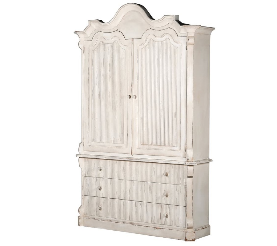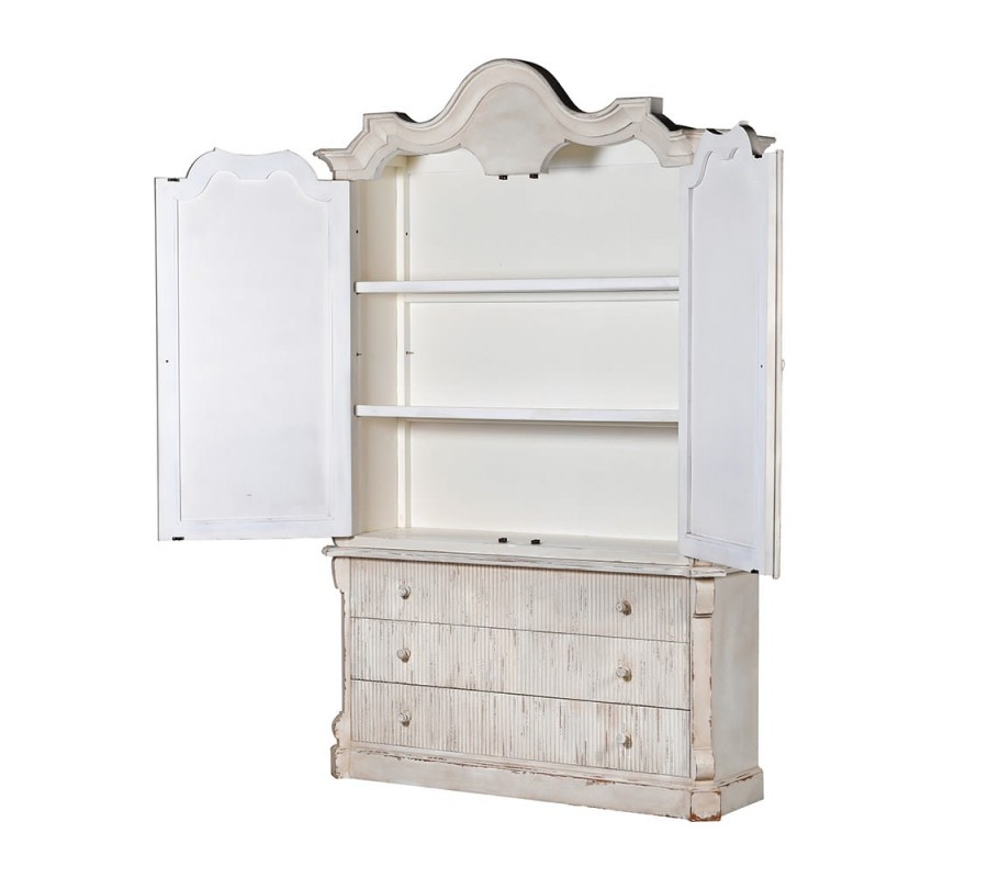 Štýlová vysoká skriňa s ozdobnými prvkami zaujme milovníkov vidieckeho a vintage štýlu. Skriňa je vyrobená z mahagónového dreva s bielou povrchovou úpravou. Skriňa s elegantným tvarovaním má črty typické pre vintage štýl, aj vďaka svojmu opotrebovanému vzhľadu. V skrini sa nachádza dostatok úložného priestoru vďaka trom veľkým zásuvkám a trom poličkám. Poličky sú chránené dvomi dvierkami. Jednoduché vertikálne dekoračné výrezy sa nachádzajú na povrchu zásuviek a povrchu dverí, ktoré dodávajú skrini zaujímavý vzhľad. Úchytky majú jednoduchý okrúhly tvar a taktiež sú vyrobené z masívneho dreva. Skriňa sa hodí do svetlých a priestranných priestorov, kde prevládajú jemné a pastelové farby. Priestor odporúčame doplniť bytovými doplnkami v duchu nostalgie a romantiky. Typické pre vidiecky a vintage štýl sú ľanové a bavlnené látky, ktoré dodávajú miestnosti príjemnú atmosféru. Skriňu odporúčame kombinovať so svetlými nábytkami z masívneho dreva vo vidieckom, provensálskom, či vintage štýle.
