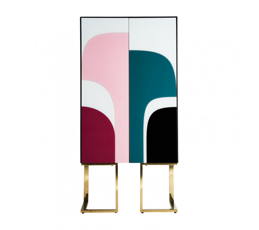 Luxusná art-deco barová skrinka Bluejay s farebným vzorom na dvierkach so sklenenými poličkami a zlatými kovovými nohami 161cm