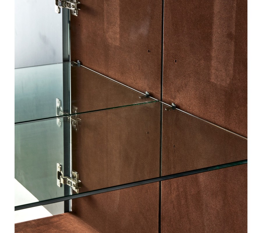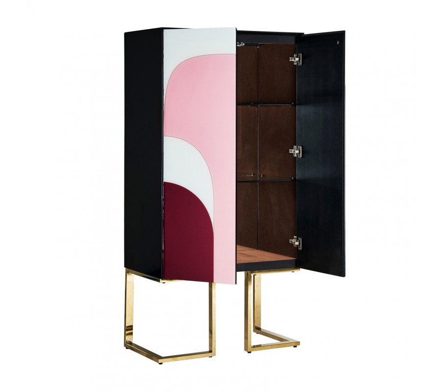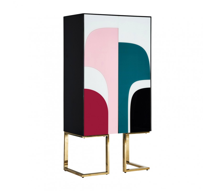 Dizajnová skriňa Bluejay je veľmi unikátnym a farebným kúskom, ktorý osvieži a oživí váš interiér ladený v štýle art-deco. Čierna drevená skriňa disponuje dvierkami s atypickým vzorom, ktorý kombinuje bielu, čiernu, červenú, svetlo rúžovú a tyrkysovú farbu. Svetlý farebný vzhľad je doplnený výraznými zlatými kovovými nožičkami v podobe dvoch podstáv v tvare písmena L. Dizajnová skriňa Bluejay taktiež disponuje hnedým vnútrom s úložným priestorom v podobe sklenených poličiek a zrkadlovou zadnou doskou, vďaka čomu skriňa naberá zaujímavú a unikátnu vlastnoť, a taktiež jej úložný priestor sa opticky zväčší. Dvierka aj rukoväte skrinky sú na povrchu sklenené, čo skrinke dodáva nádych luxusu a opulentnosti. Vďaka svojmu farebnému vyhotoveniu sa skriňa Bluejay vynikajúco kombinuje v tmavo ladených interiéroch, v ktorých vynikne farebný vzor na dvierkach, alebo vo svetlých interiéroch v ktorých sa zvýrazní čierna farba a zlaté kovové nožičky.