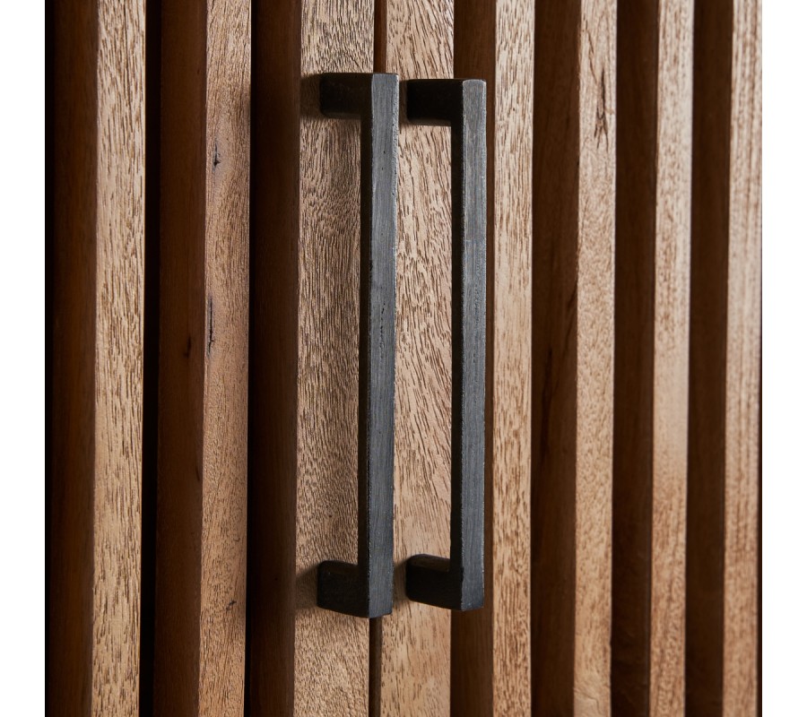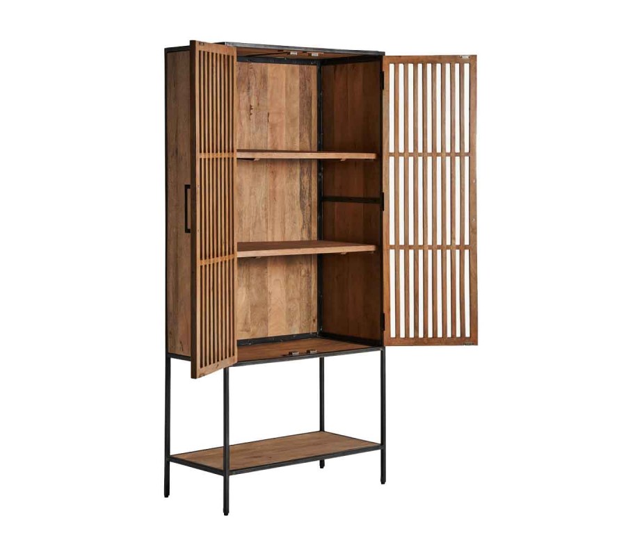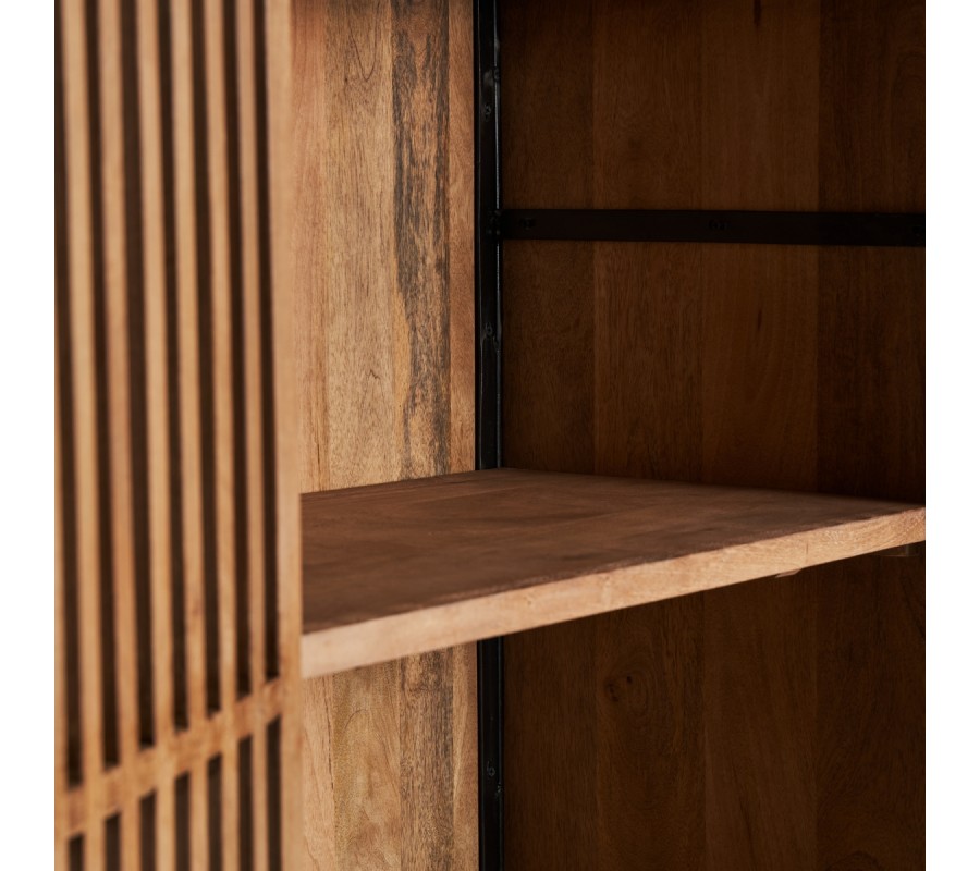 Skriňa Dureti predstavuje dizajnové prepojenie industriálneho štýlu s elegantným prevedením, čím vzniká unikátny kúsok s moderným nádychom. Skriňa je vyrobená z masívneho mangového dreva v teple hnedej farbe, ktoré dopĺňa čierna kovová konštrukcia dotvárajúca industriálny vzhľad. Poskytuje bohatý úložný priestor v podobe troch priestranných poličiek s dvojicou dvierok a jednej otvorenej poličky v spodnej časti. Vďaka univerzálnemu prevedeniu je skriňu Dureti možno využiť ako šatníkovú skriňu na doladenie spálne, ale svoje miesto si nájde aj v obývačke, kancelárii či v barovom kútiku. Zaujímavým prvkom sú dvierka obohatené o zvislé obdĺžnikové výrezy vytvárajúce unikátny moderný vzhľad. Vkusný vzhľad skrine Dureti vynikne v svetlejšie aj tmavšie ladených priestoroch zariadených ďalším masívnym nábytkom, doplnkami z kovu a dizajnovou čalúnenou sedačkou, posteľou či kreslom.