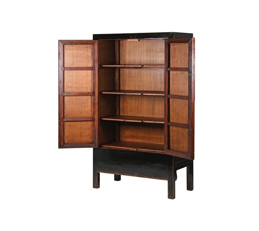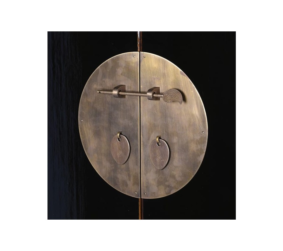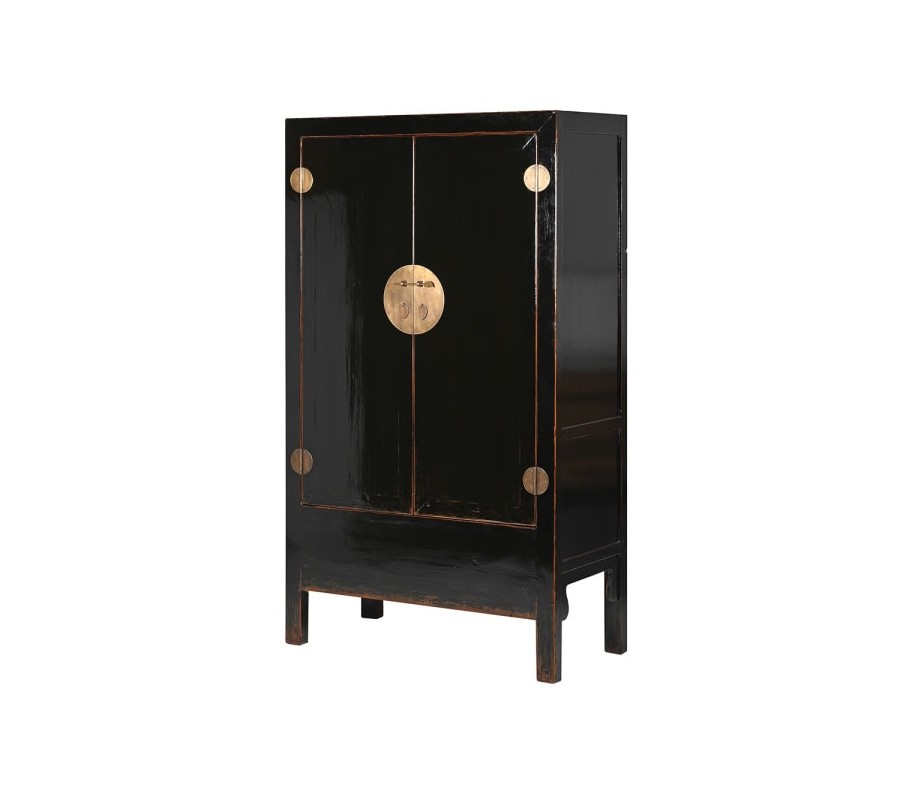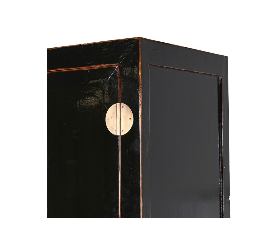 Luxusne pôsobiaci dizajn skrine z našej kolekcie Kolorida spočíva v kvalitnom materiály a klasickom prevedení využívajúcom univerzálnu farebnosť. Tento kúsok je vyrobený z kvalitného masívneho dreva s čiernou povrchovou úpravou, ktorá je doplnená o štýlovú patinu vytvárajúcu dojem ošúchaného starožitného nábytku. Dotvára tak nezameniteľný nádych štýlu vintage. Skriňa poskytuje úložný priestor v podobe štyroch poličiek, pričom vnútro sa nesie v naturálnej hnedej farbe s viditeľnou kresbou dreva. Dvojica dvierok je doplnená o výraznú mosadznú rukoväť dopĺňajúcu celkový vintage vzhľad. Efektné kovové pliešky zdobia okrem rukoväte aj pánty dvierok. Elegantné nožičky dotvárajú elegantný vzhľad skrine a zároveň spĺňajú aj praktickú funkciu pri uľahčení manipulácie či prístupu. Skriňa Kolorida skvelo poslúži v spálni na uskladnenie šatstva, ale i v pracovni na organizáciu vašich dokumentov. Možno ju tiež využiť v barovom kútiku alebo v obývačke. Skvelo zapadne do vintage i orientálne ladených priestorov v kombinácii so zlatými doplnkami a luxusným zamatovým čalúneným kreslom či sedačkou.