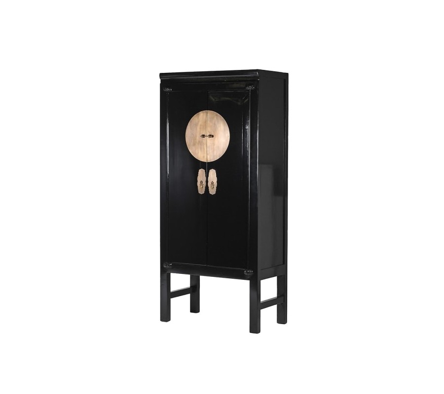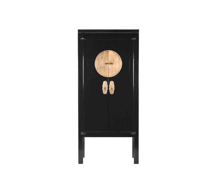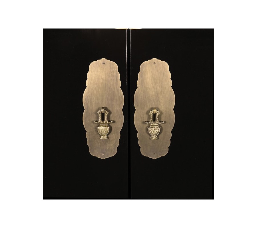 Unikátny vzhľad skrine Kolorida vkusne doplní vintage i orientálne ladené priestory. Skriňu s všestranným využitím možno umiestniť v obývačke či barovom kútiku, rovnako ako aj v spálni, kancelárii alebo v hosťovskej izbe. Ponúka vám úložný priestor v podobe štyroch priestranných poličiek za dvojicou dvierok. Kvalitné masívne drevo sa postará o výbornú stabilitu a dlhú životnosť, zatiaľčo samotné prevedenie poteší všetkých milovníkov štýlu vintage. Čierna povrchová úprava vonkajšej časti skrine dopĺňa naturálne hnedé vnútro. Dominantou dizajnu skrine Kolorida je zlaté kovové zdobenie v podobe štýlových úchytov a systému zamykania. Vyššie nožičky okrem estetickej funkcie spĺňajú aj praktickú funkciu pri uľahčení manipulácie a prístupu. Skriňu možno využiť na uskladnenie oblečenia, dokumentov či ako barovú skrinku v jedálni či obývačke. Skvelú kombináciu vytvorí s luxusnou čalúnenou sedačkou či kreslom so zamatovým alebo koženým čalúnením a rôznymi sklenenými či kovovými dekoráciami zlatej farby.