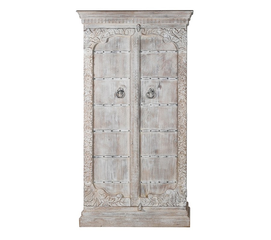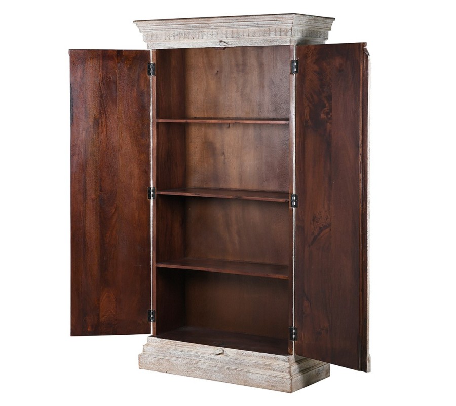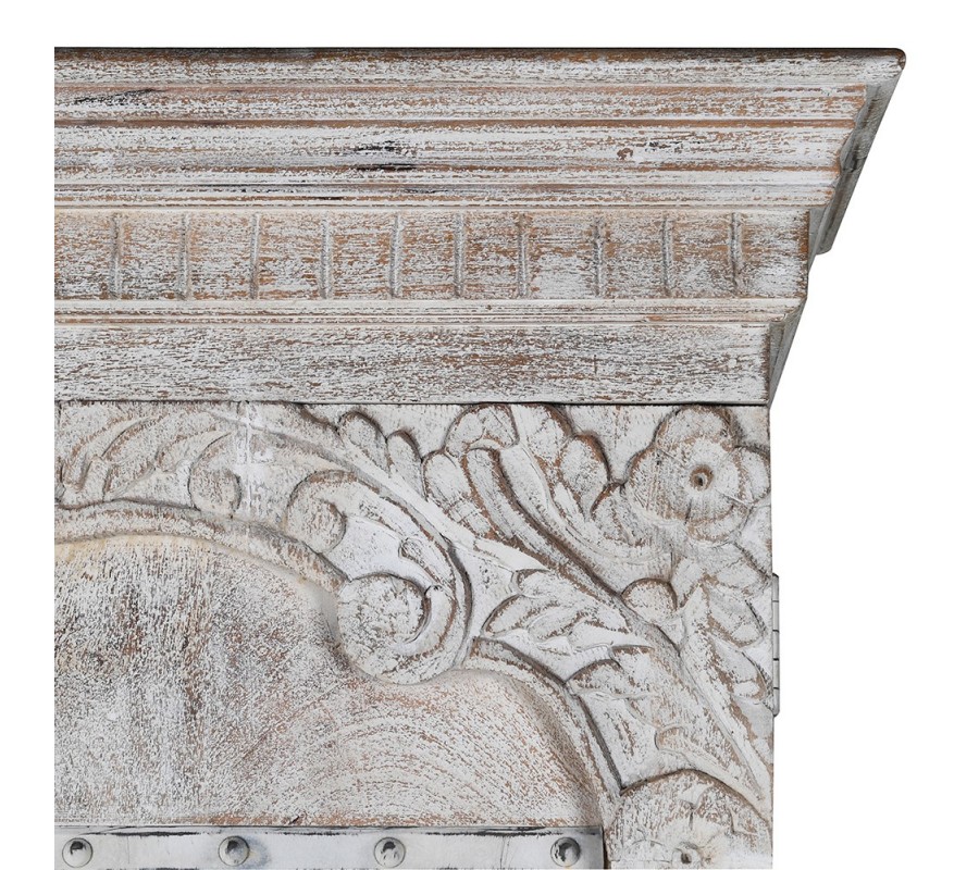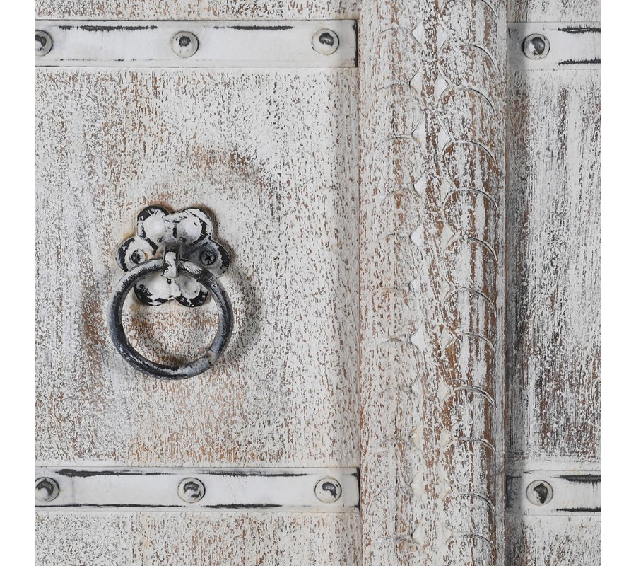Skriňa je vyrobená z mangového dreva a jeho prírodná bohatá hnedá farba je viditeľná v interiéri úložného priestoru. Vonkajší povrch je upravený svetlým náterom so zošúchaným efektom, ktorý prináša do kompozície šarmantný vintage nádych. Dvojité dvierka sa otvárajú pomocou okrúhlych úchytiek umiestnených v ich vrchnej tretine. Sú vyrobené z kovu a k dvierkam sa pripíjajú cez florálny ornament. Čiastočne ich pokrýva biely náter a dizajnovo korešpondujú so šiestimi horizontálnymi kovanými pásmi plynúcimi cez dvierka.