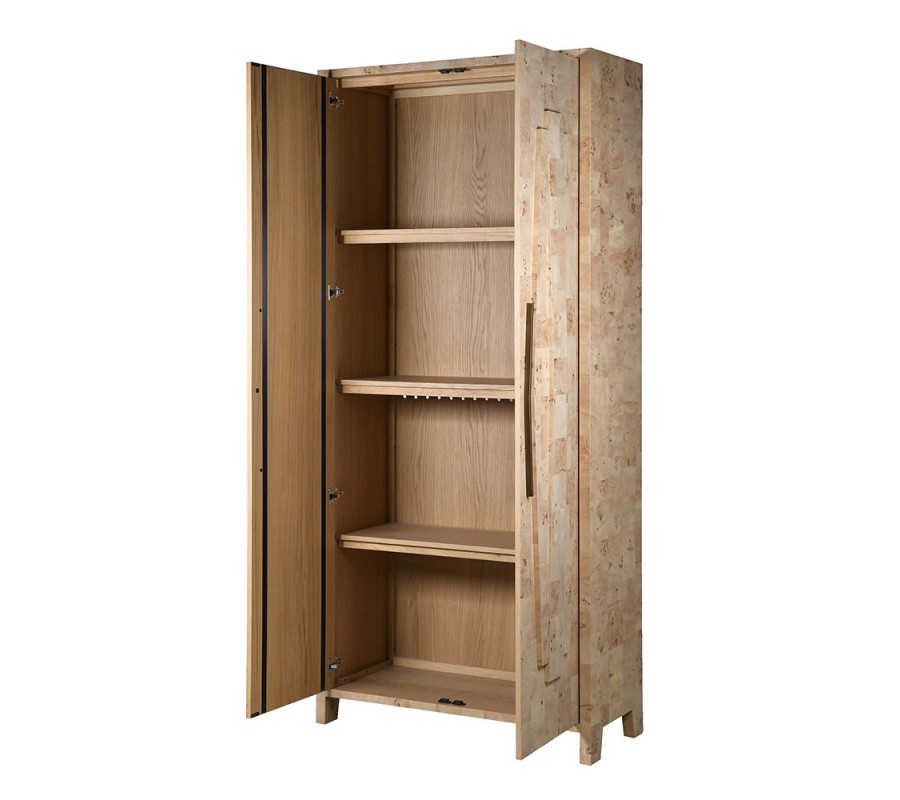 Luxusná skriňa Ygritte vás uchváti svojím masívnym dreveným dizajnom. Jej povrch je pokrytý dyhovaným burl drevom, ktoré je luxusným a vzácnym materiálom. Pochádza výlučne z hrčovitých výrastkov na kmeni alebo konároch stromov a je veľmi obľúbeným medzi dizajnérmi vďaka svojej jedinečnej a komplexnej kresbe, ktorá je výsledkom nepravidelného rastu drevitých vlákien. Ten má tiež vplyv na konzistenciu - burl je tvrdší, ako bežné drevo, čo z neho robí pevný a odolný materiál. Pri detailnejšom pohľade si na skrini Ygritte všimnete jedinečné prírodné štruktúry a vzory. Okrem toho zdobí predné dvere reliéfny ornament so zaoblenými bočnými hranami. Ich tvaru sa prispôsobujú dlhé úchytky na otváranie dverí v tvare dvoch zrkadliacich sa poloblúkov. Tento dizajn v kombinácii s dlhými vertikálnymi líniami dekoratívneho reliéfu pôsobí ako avantgardné vyobrazenie štíhleho stromu na pozadí lesa. Prírodný charakter predurčuje skriňu Ygritte do miestností zariadených masívnym dreveným nábytkom, ktorý môžete doplniť živými zelenými rastlinami. Je tiež skvelou voľbou do spálne zariadenej vo vidieckom štýle, kde ju môžete doplniť posteľou alebo komodou so svetlého dreva v teplých odtieňoch a vzorovanými textíliami. Okrem vizuálneho zážitku vám skriňa poskytne veľké množstvo úložného priestoru na štyroch policiach.