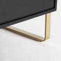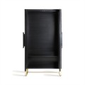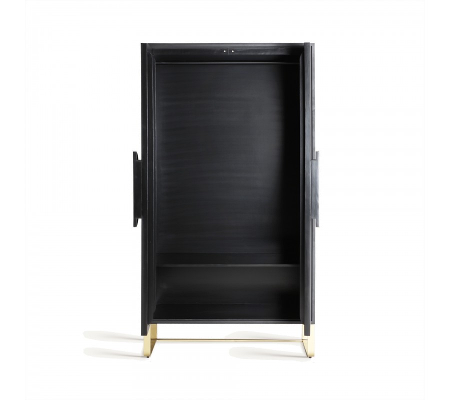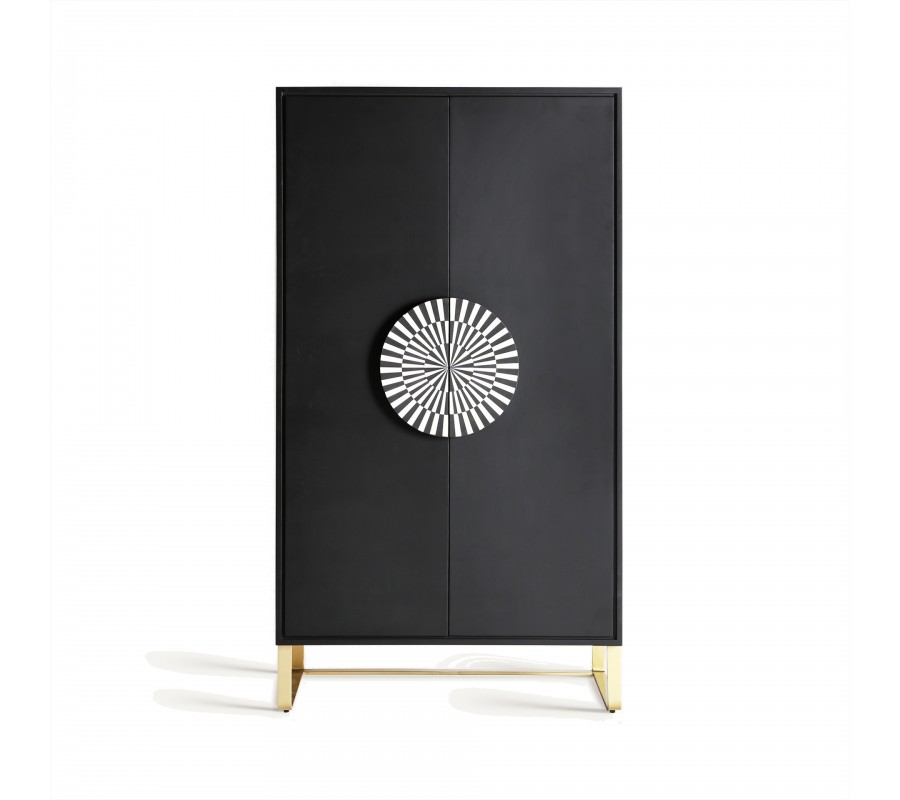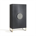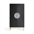 Luxusná skriňa Tesoreria dodá vášmu domovu nezameniteľnú estetiku a luxus art deco štýlu. Minimalistická silueta je vyvážená extravagantnými úchytkami na otváranie dvojitých dverí, ktoré sa spájajú v celistvom kruhovom dizajne. Sú ozdobené kosťovou inkrustáciou v čiernej a bielej farbe, ktorá vytvára vzor slnečných lúčov. Drevené časti skrine sú v matnej čiernej farbe, ktorá jej dodáva majestátny a sofistikovaný vzhľad. Zlaté nožičky sú zhotovené z kovu a na bočných a zadnej strane spojené podstavou. Nábytok má tak zvýšenú stabilitu a taktiež zaujímavý vizuálny prvok v spodnej časti. Kovové prvky tiež umožňujú prepojenie s ďalším nábytkom v art-deco štýle s lesklými nožičkami či úchytkami. Skriňu oceníte aj pre jej veľký úložný priestor a policu v spodnej časti. Môžete ju umiestniť ako akcentový prvok do predsiene a doplniť štýlovým zrkadlom s čiernobielym rámom. V spálni je skvelou voľbou kombinácia s nočným stolíkom a komodou Tesoreria, ktoré dodajú priestoru dominantný vizuálny prvok. Skvele oživí aj monochromatické priestory. Pre extravagantnejší glamour vzhľad ju môžete skombinovať aj s pestrými farbami a lesklými metalickými doplnkami. Skriňa Tesoreria nie je len praktickým úložným priestorom, ale tiež výrazným dekoračným prvkom, ktorý dodá každému priestoru elegantný a luxusný vzhľad.