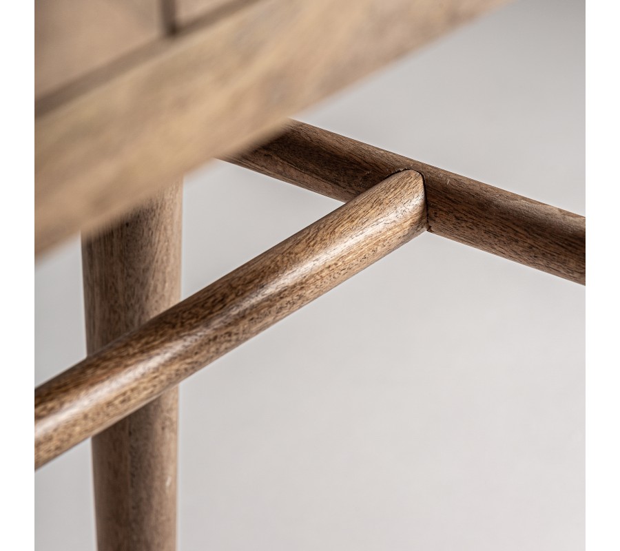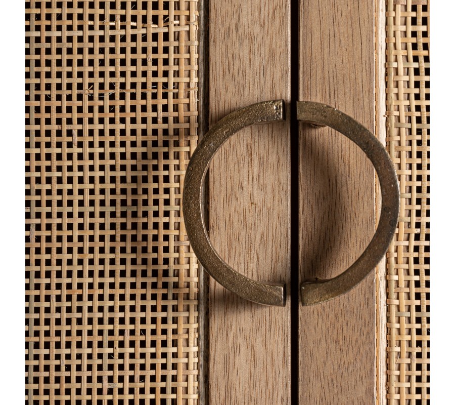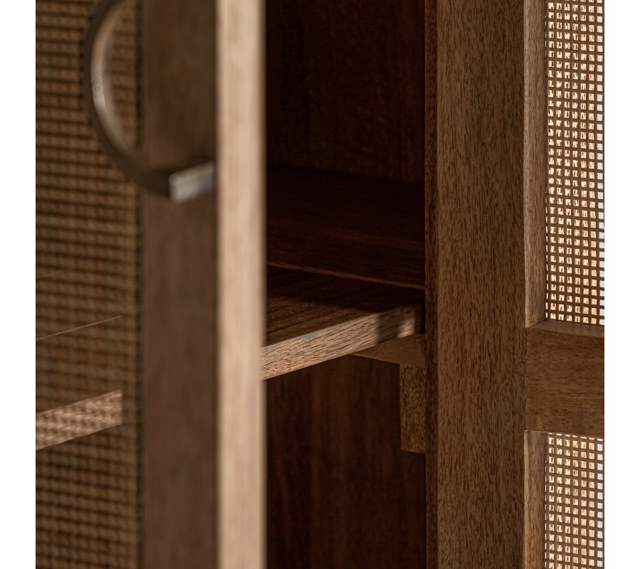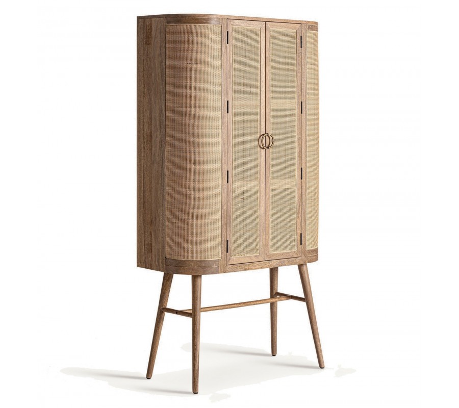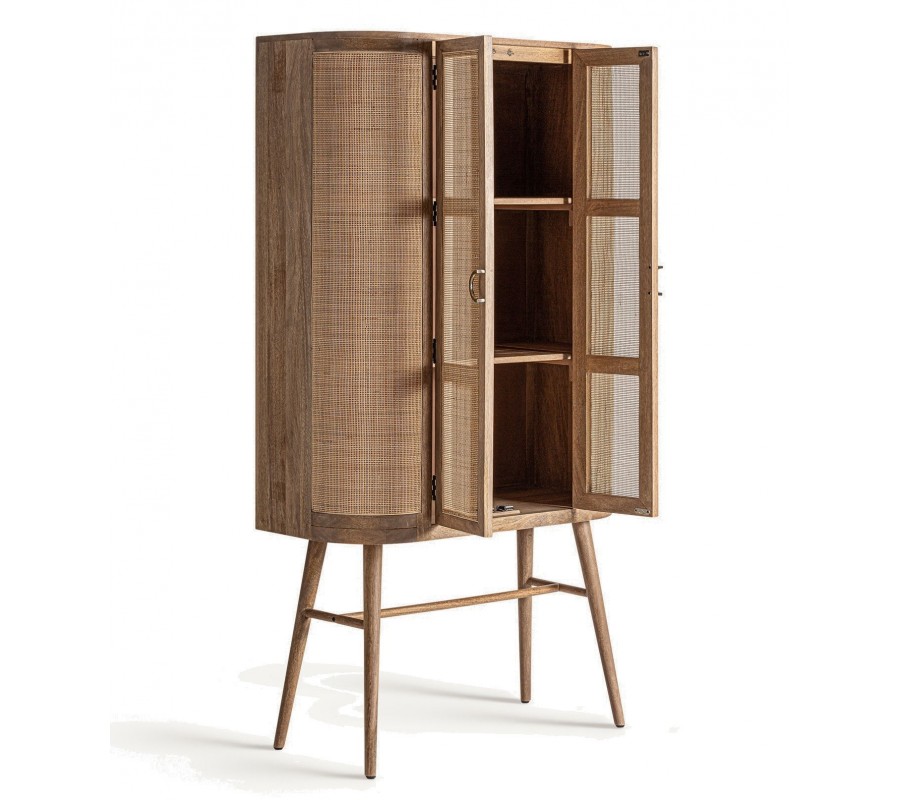 Skriňa je vyrobená z mangového dreva. Dvierka a bočné panely sú vyplnené výpletom z prútia, na dvierkach je priehľadný a po bokoch podložený drevom. Originálny silueta je inšpirovaná retro nábytkom. Predná strana má charakteristický zaoblený tvar. Zadná strana je klasická, hranatá. Skriňa stojí na štyroch tenkých nožičkách, ktoré sú mierne zošikmené a prepojené spojnicou v tvare H, ktorá zaručuje skvelú stabilitu nábytku.