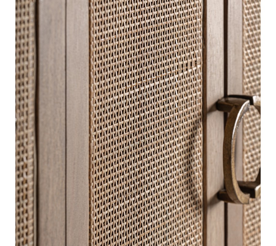 Farebne sa skriňa nesie v naturálnych svetlých hnedých odtieňoch. Harmonickým dojmom pôsobí aj kombinácia štruktúr - prírodnej kresby letokruhov na drevených častiach a jednoduchý mrežovitý prútený výplet na prednej strane. Môžete pridať živé zelené rastliny, čím ešte zdôrazníte naturálny charakter nábytku a vytvoríte tak skutočnú oázu vo vašom domove.