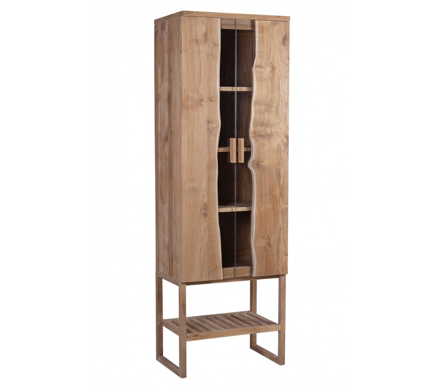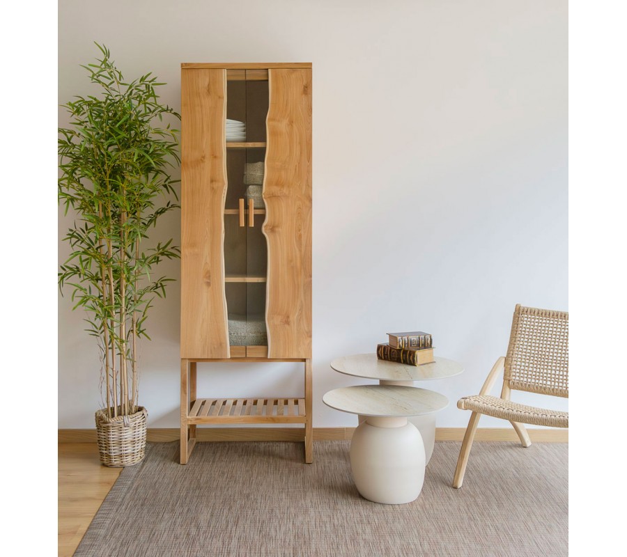 Skrinka je vyrobená z masívneho teakového dreva v naturálnej svetlej hnedej farbe. V jedálni či obývačke ju môžete využiť ako vitrínu, na uskladnenie riadu, či ako barovú skrinku. Hodí sa aj do spálne, ako úložný priestor na oblečenie či doplnky. Môžete ju skombinovať s ďalším moderným nábytkom v svetlých odtieňoch z masívneho dreva. Hodí sa do priestorov zariadených v svetlých neutrálnych odtieňoch.