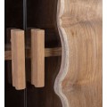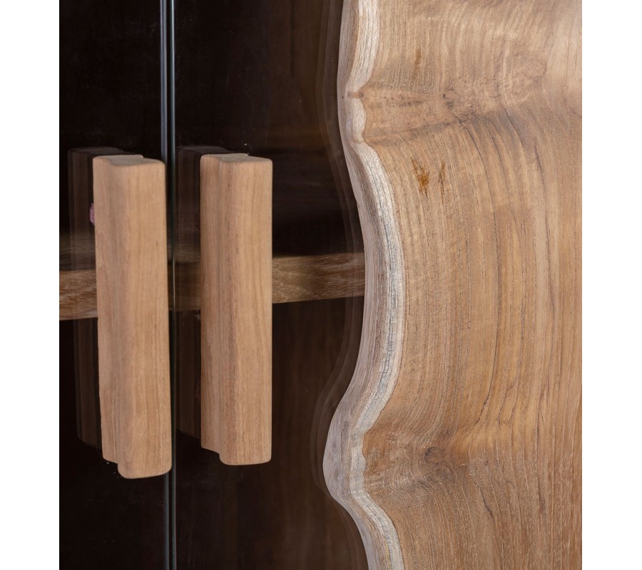 Dominantným prvkom nábytku sú dvojité dvierka z kombinácie dreva a skla. Bočné časti sú drevené, zatiaľ čo v strede sa nachádza pás priehľadného skla. Okraje drevených častí sú nerovné a sledujú prirodzenú štruktúru letokruhov. Vzniká tak vizuálne podmanivý moderný dekoratívny prvok inšpirovaný prírodou, v ktorom presklená časť pripomína prírodnú štrbinu v dreve.