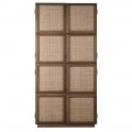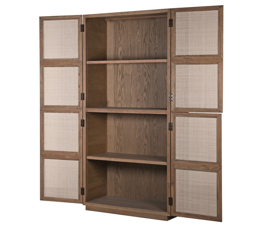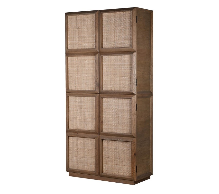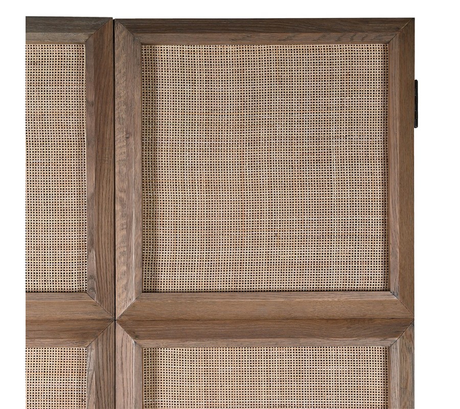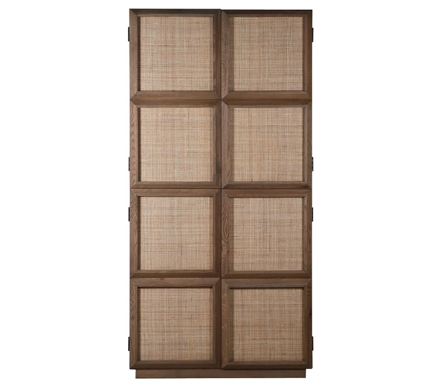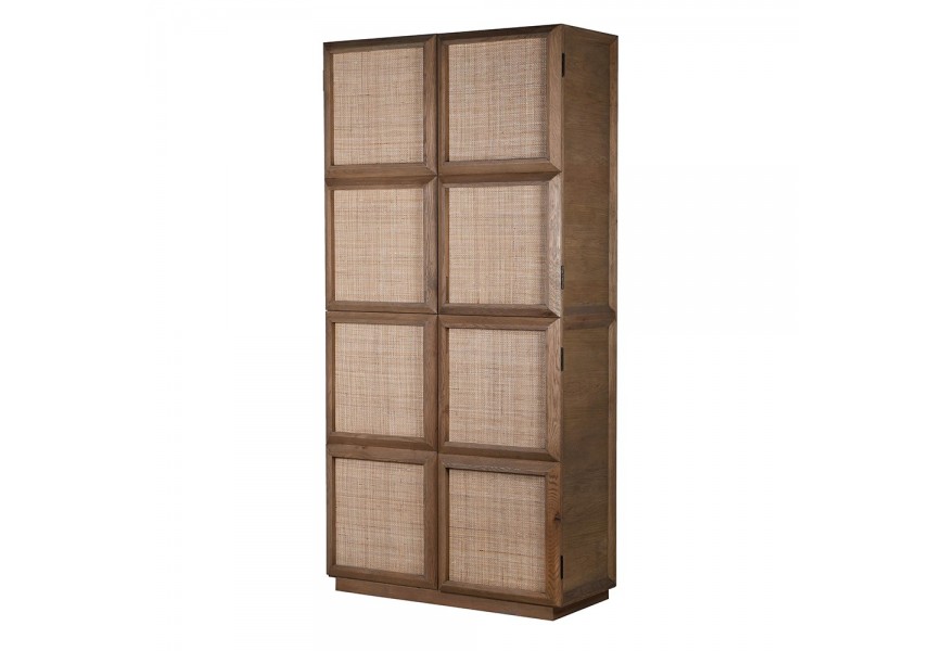 Skriňa sa nesie v prírodných farbách hnedých teplých odtieňov z kvalitného dubového dreva. Disponuje štyrmi dverami, ktorých povrch tvorí štruktúra letokruhov v hnedej svetlej farbe. Dvere sa vyrezávaním členia na štvorce, ktoré sú vypletené v svetlej hnedej farbe. Výplet je jemne priehľadný pri otvorení dvier a pripomína ratan.
