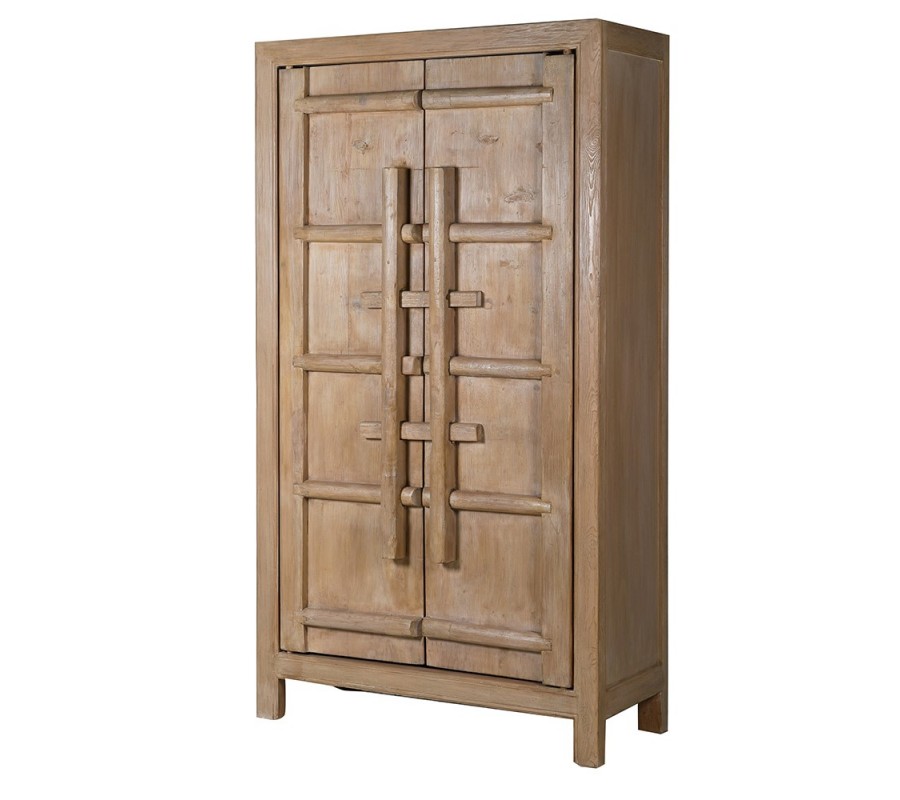 Skriňa obsahuje úložný priestor s tromi vysokými policovými miestami. Uzatvára sa dvojitými dvierkami, ktoré sú dominantný dizajnovým prvkom nábytku. Na ich vonkajších okrajoch sú umiestnené dve vyvýšené lamely, ku ktorým je pripojených päť horizontálnych dekoratívnych valcovitých drevených tyčí, prechádzajúcich cez celú šírku dvierok. Križujú ich dve dlhé vertikálne úchytky na otváranie a vzniká tak geometrický štvorcový vzor. Vo vrchnej a spodnej časti úchytiek sa nachádzajú otvory, do ktorých je možné zasunúť dva drevené kolíky pre bezpečné uzavretie.