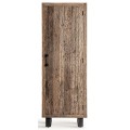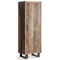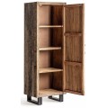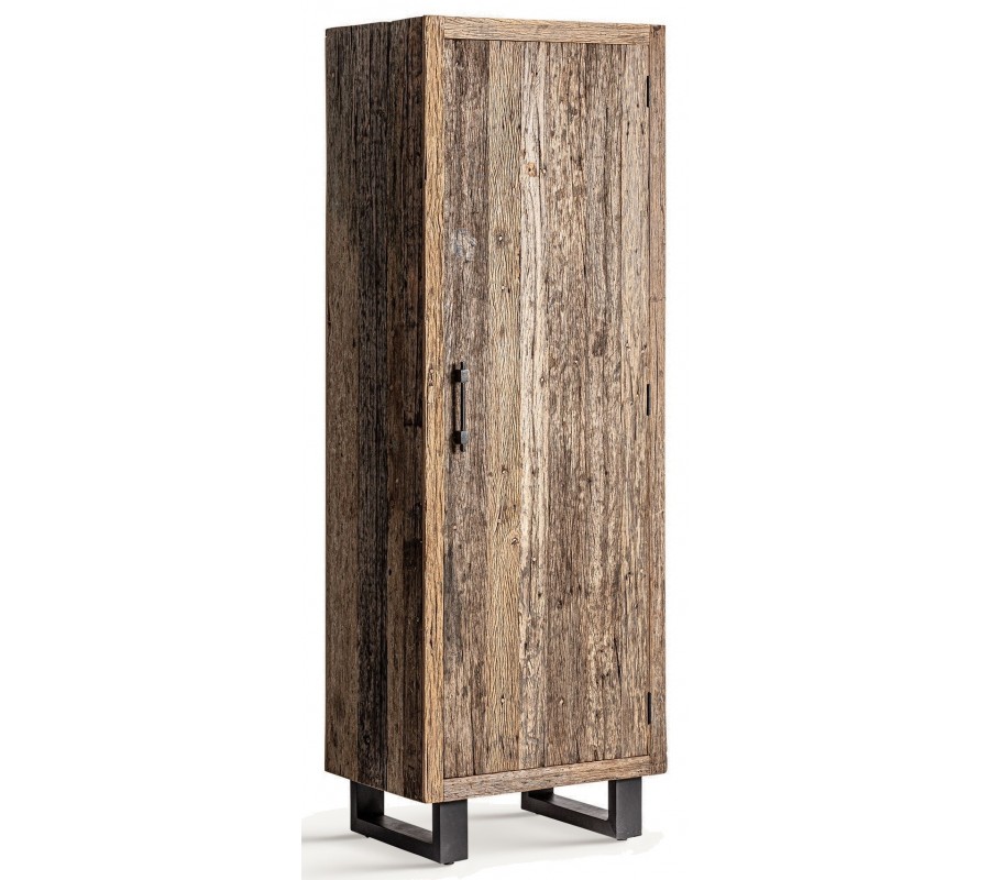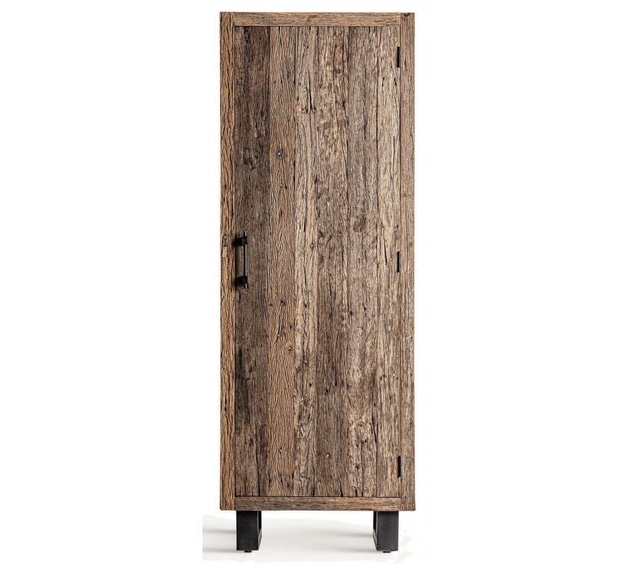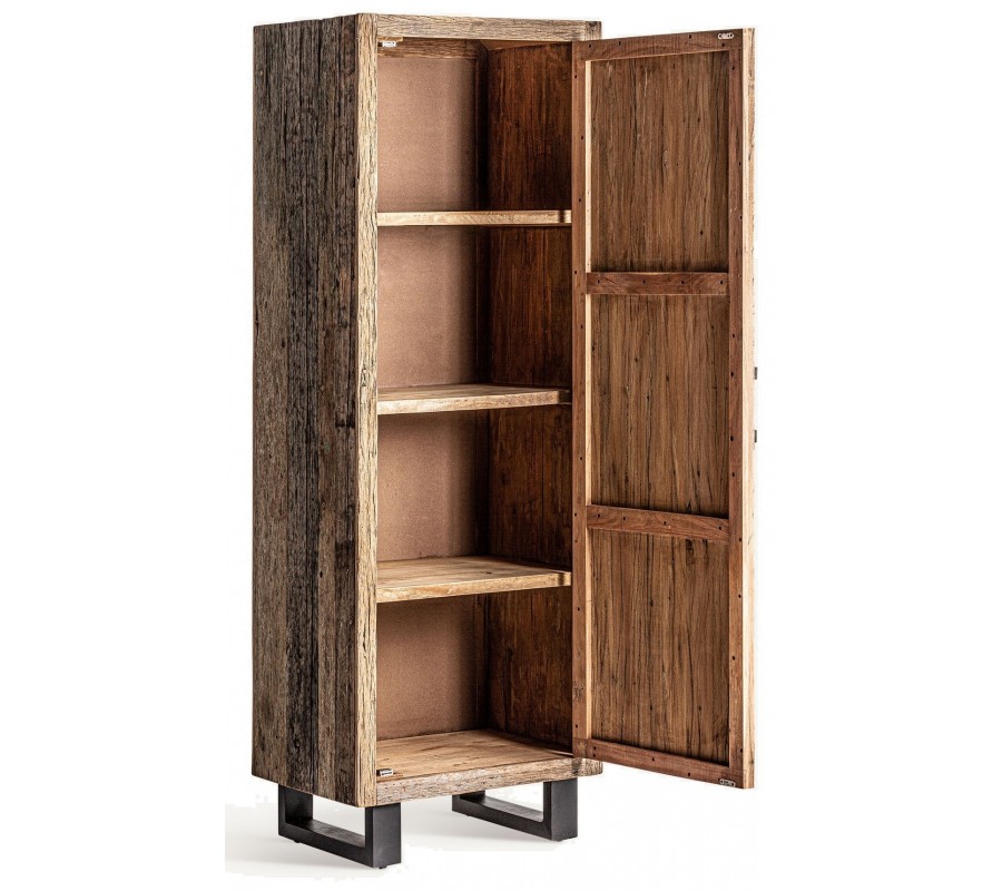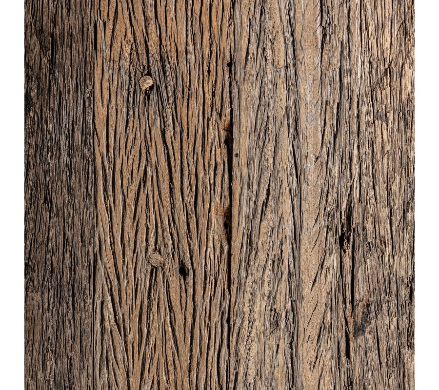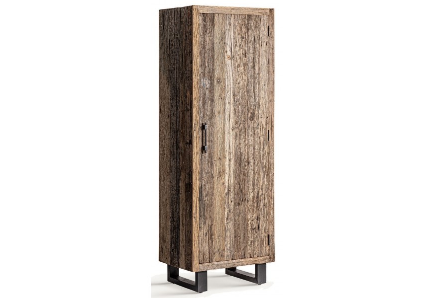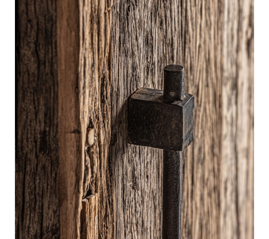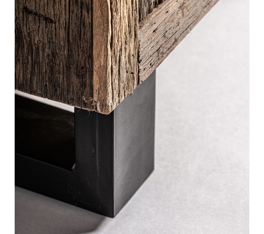Luxusná industriálna skriňa Rebe je vyrobená z masívneho dreva s výraznou, surovo pôsobiacou štruktúrou letokruhov a povrchových nerovností, ktoré umocňujú autentický vzhľad recyklovaného materiálu. Prírodný odtieň hnedej s jemným sivastým nádychom vytvára jedinečný kontrast ku kovovým hranatým nožičkám v čiernej farbe, ktoré zabezpečujú stabilitu a zároveň zdôrazňujú industriálny charakter nábytku.