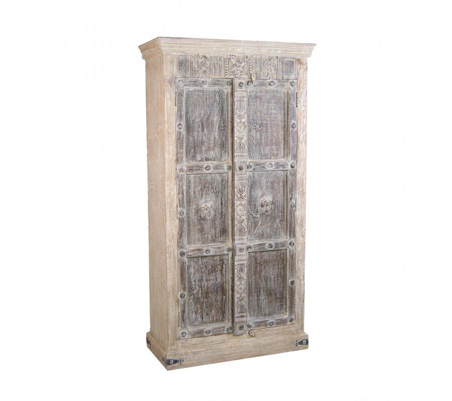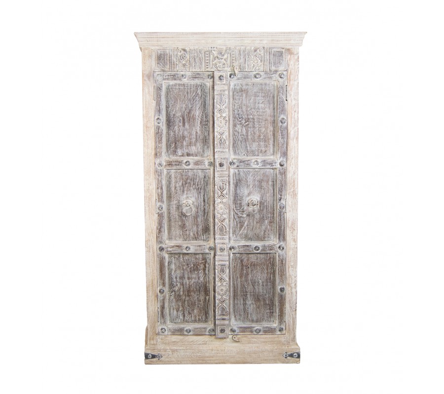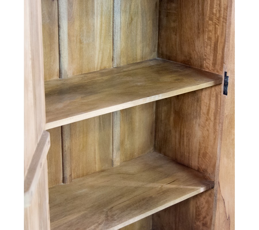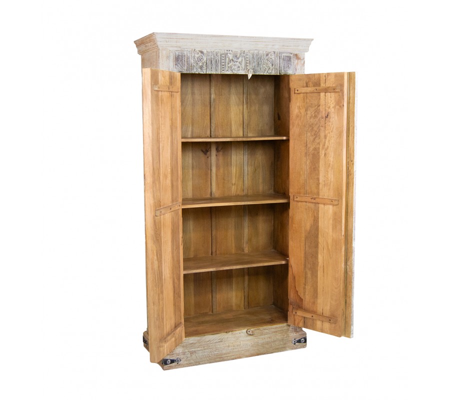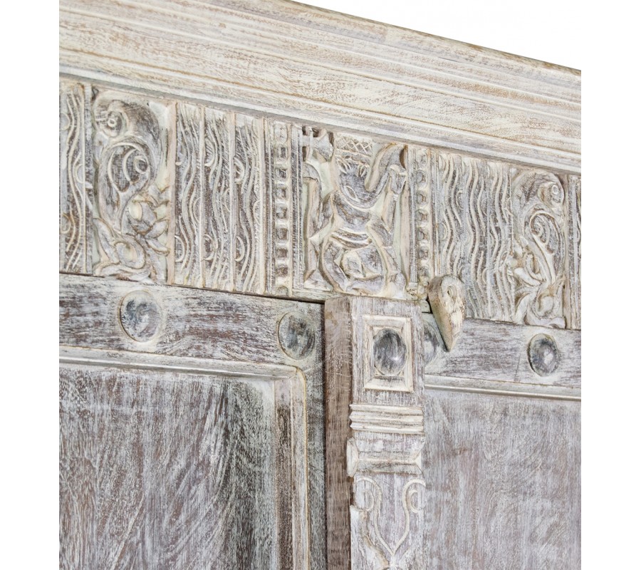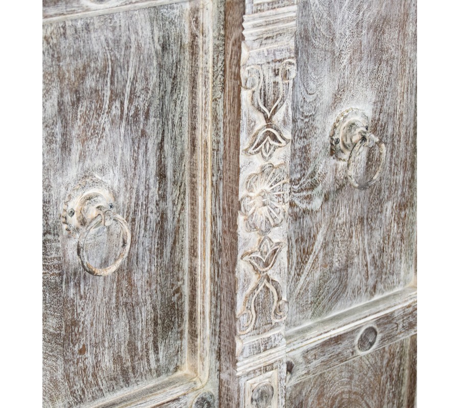 Skriňa je vyrobená z masívneho mangového dreva, ktoré v kombinácii s ručným opracovaním zaručuje pevnosť a odolnosť. Jeho naturálna teplá svetlohnedá farba je viditeľná v interiéri úložného priestoru, zatiaľ čo na vonkajšej strane je kombinované prevedenie v kontrastnej svetlej a tmavej hnedej farbe. Dizajn zjednocuje biely náter s vymytým efektom, ktorý dodáva nábytku výrazný vintage vzhľad a zvýrazňuje naturálnu štruktúru dreva.