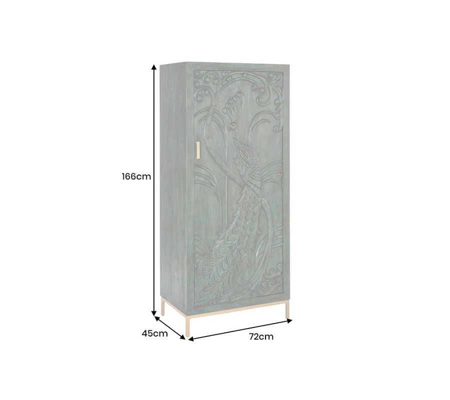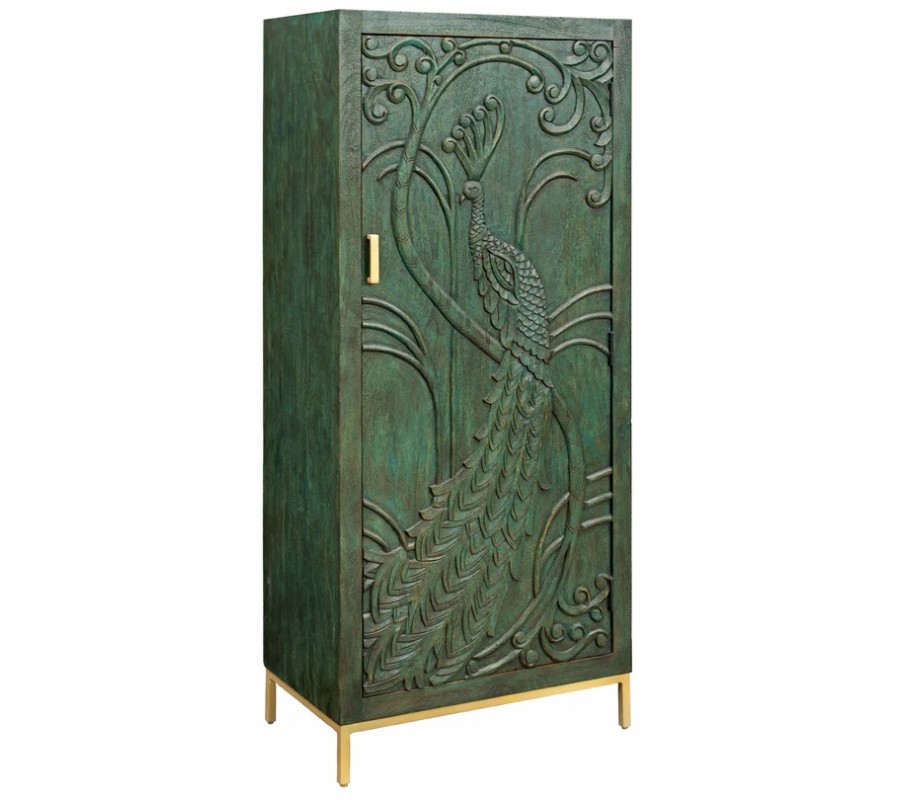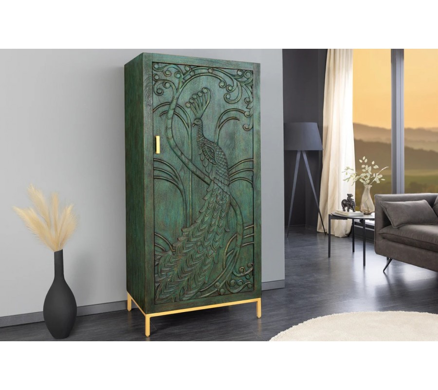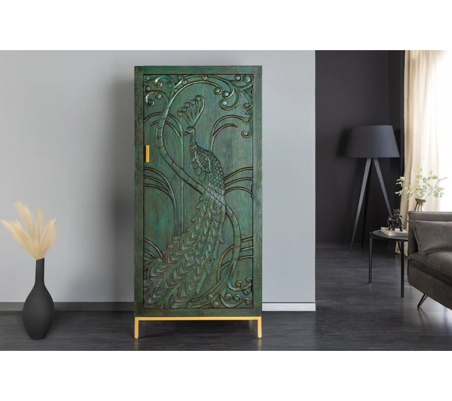 Najpôsobivejším prvkom sú jednoznačne dvierka s detailne vyrezávaným motívom páva, ktorého elegantne rozprestreté perie vypĺňa takmer celý povrch čelnej strany. Ornamentálne rytiny kombinujú perové, florálne aj rastlinné vzory, čím vytvárajú jedinečný etno umelecký efekt. Drevená štruktúra je doplnená štíhlymi kovovými nožičkami a okrúhlou úchytkou v zlatej farbe, ktoré celku dodávajú ľahkosť a nádych luxusu.