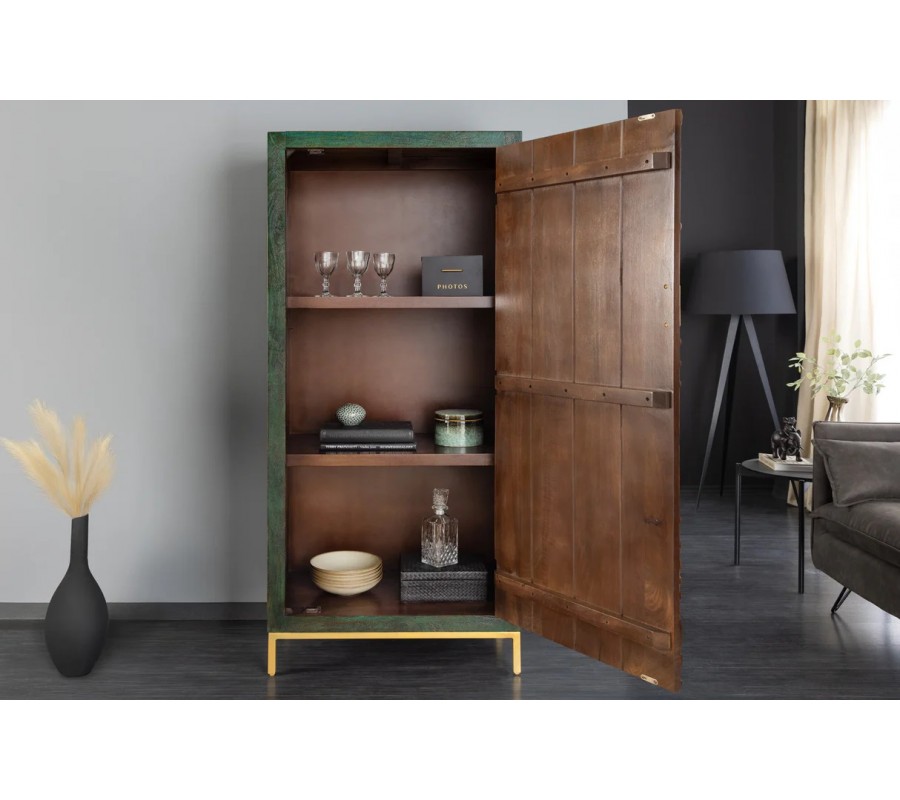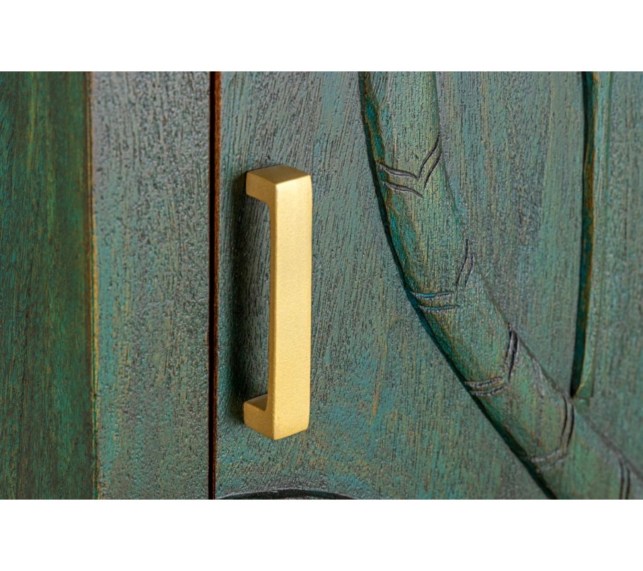 Barová skrinka Birdy zaujme už na prvý pohľad svojím výnimočným vzhľadom, ktorý kombinuje orientálny etno štýl s art deco eleganciou. Je vyrobená z masívneho mangového dreva a povrchová úprava v sýtom zeleno-petrolejovom odtieni dodáva nábytku hĺbku a výrazný prírodný charakter.